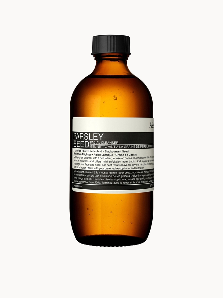 Aesop’s first gel cleanser in the Parsley Seed range offers gentle yet thorough cleansing, with the benefit of mild exfoliation from Lactic Acid and balancing from Jojoba Oil. The invigorating, rich lather of this innovative formula suits all skin types and leaves skin feeling completely cleansed, softened and clarified.Clarifying gel-based face cleanserExfoliating, softening and anti-oxidant propertiesSuits all skin types, ideal for patchy or combination