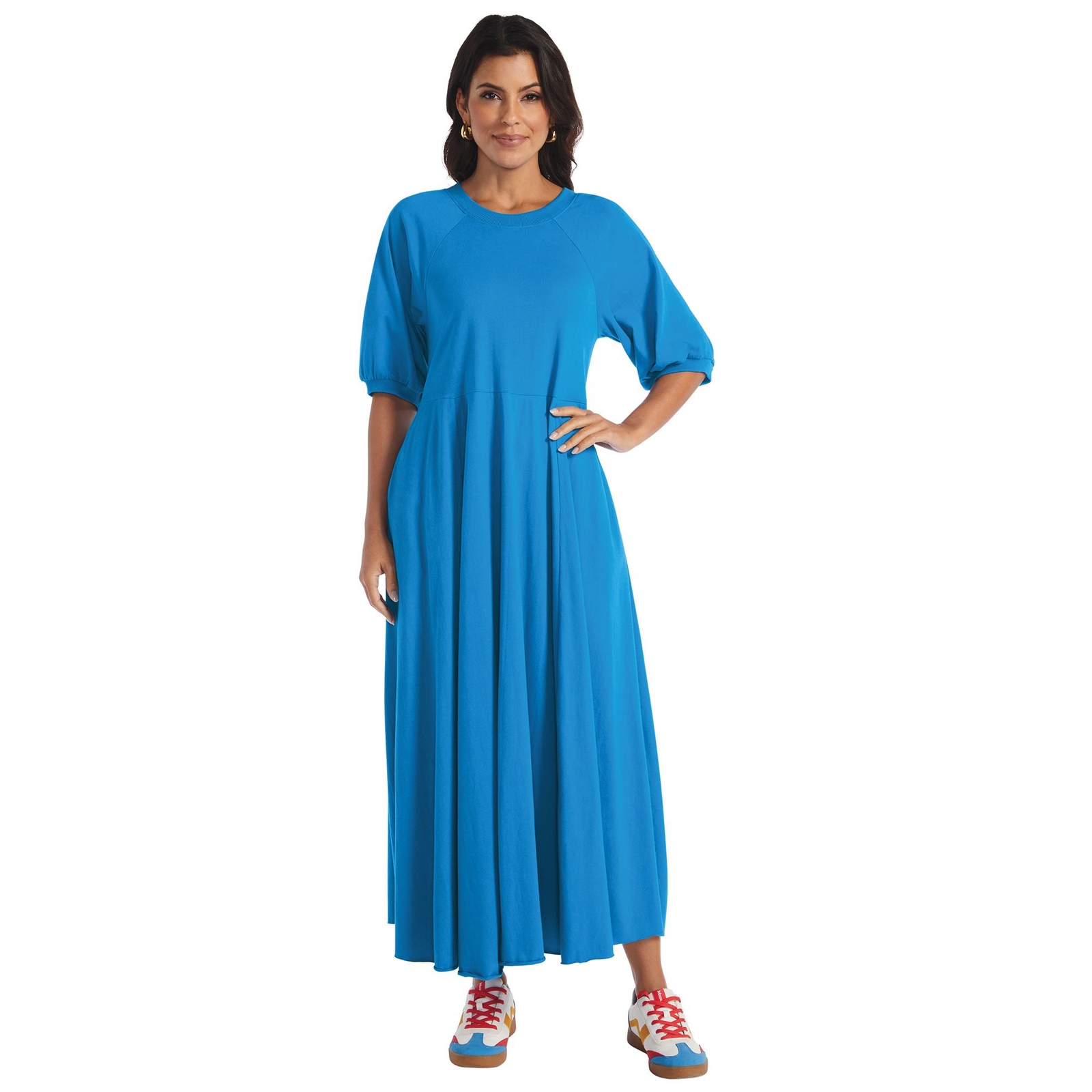 *Woven dress provides a loose, comfortable fit *Hidden placket with button closures *In-seam pockets *Belted for a flattering figure *Size M is approx. 47" long *Cotton