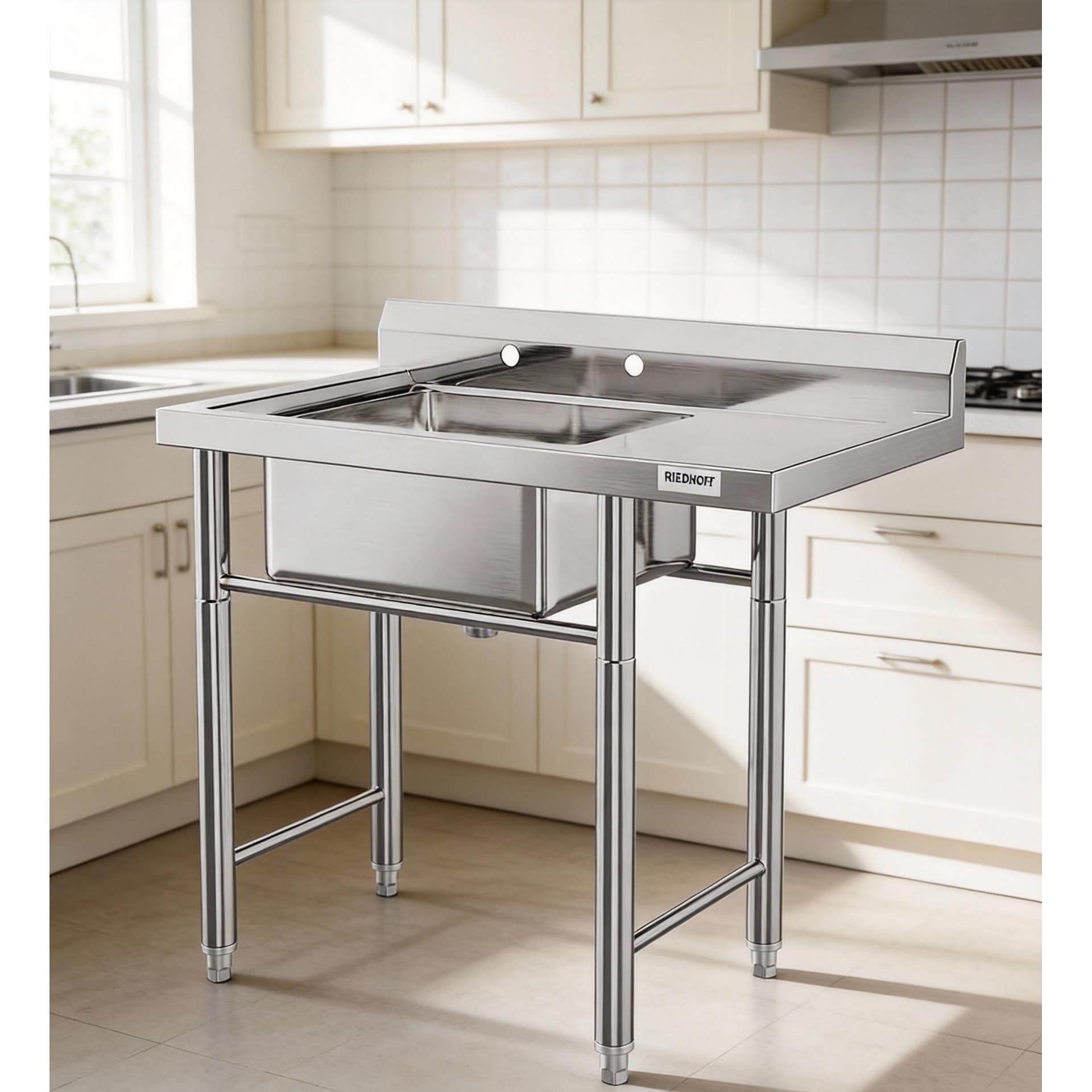 Efficiency and Functionality: The single bowl freestanding commercial sink with a faucet is meticulously designed for optimal utility in any dining environment.