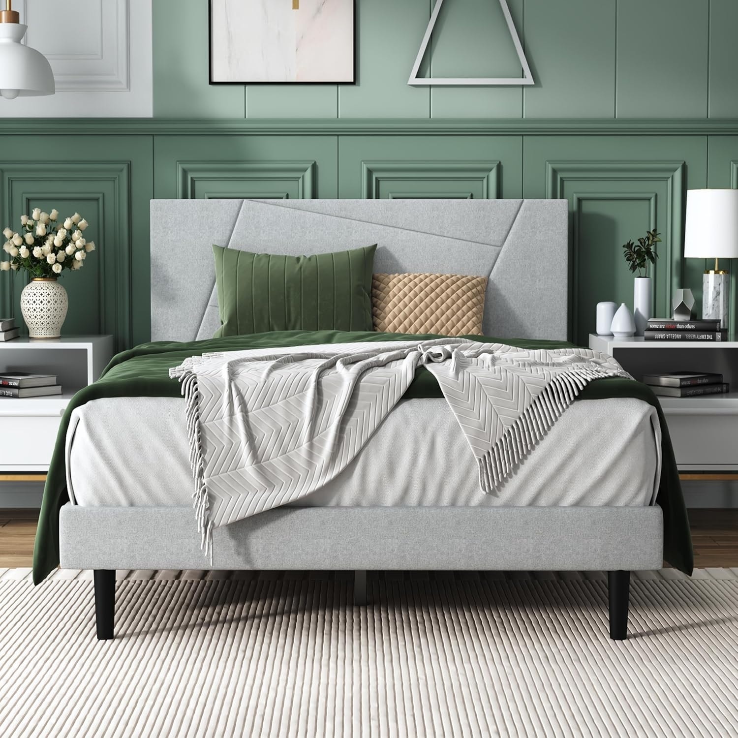 💥Queen Platform Bed with Ivory Boucle fabric Headboard, Wood Frame 💥The Queen platform bed featured with Ivory Boucle fabric Headboard and light grey wood finish offers a breath of fresh air for your bedroom.With sturdy wood construction pieces crafted…