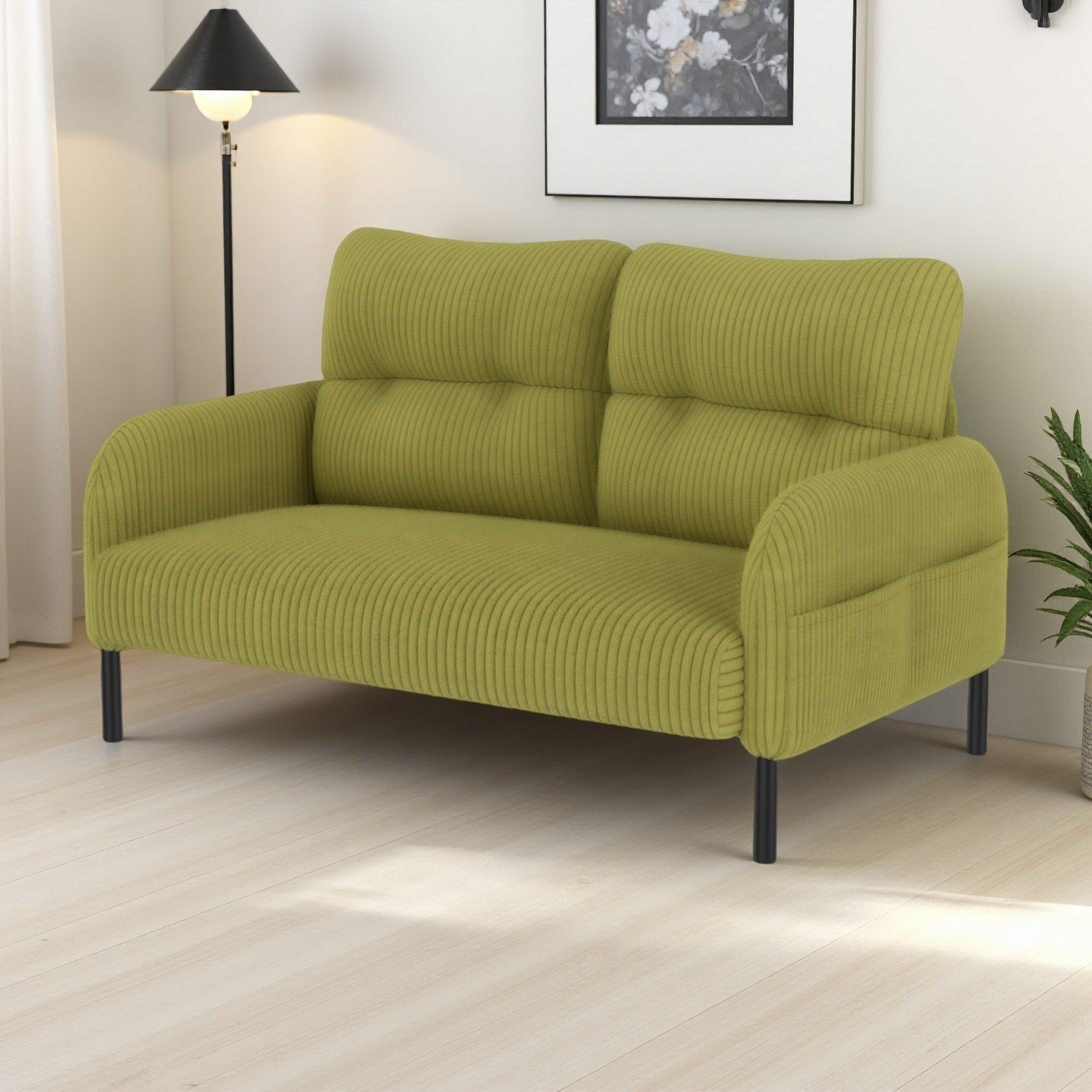 1. The sofa features soft, textured corduroy fabric—comfortable to the touch and easy to clean. It brings cozy seating and a warm, inviting look to the living room. 2.