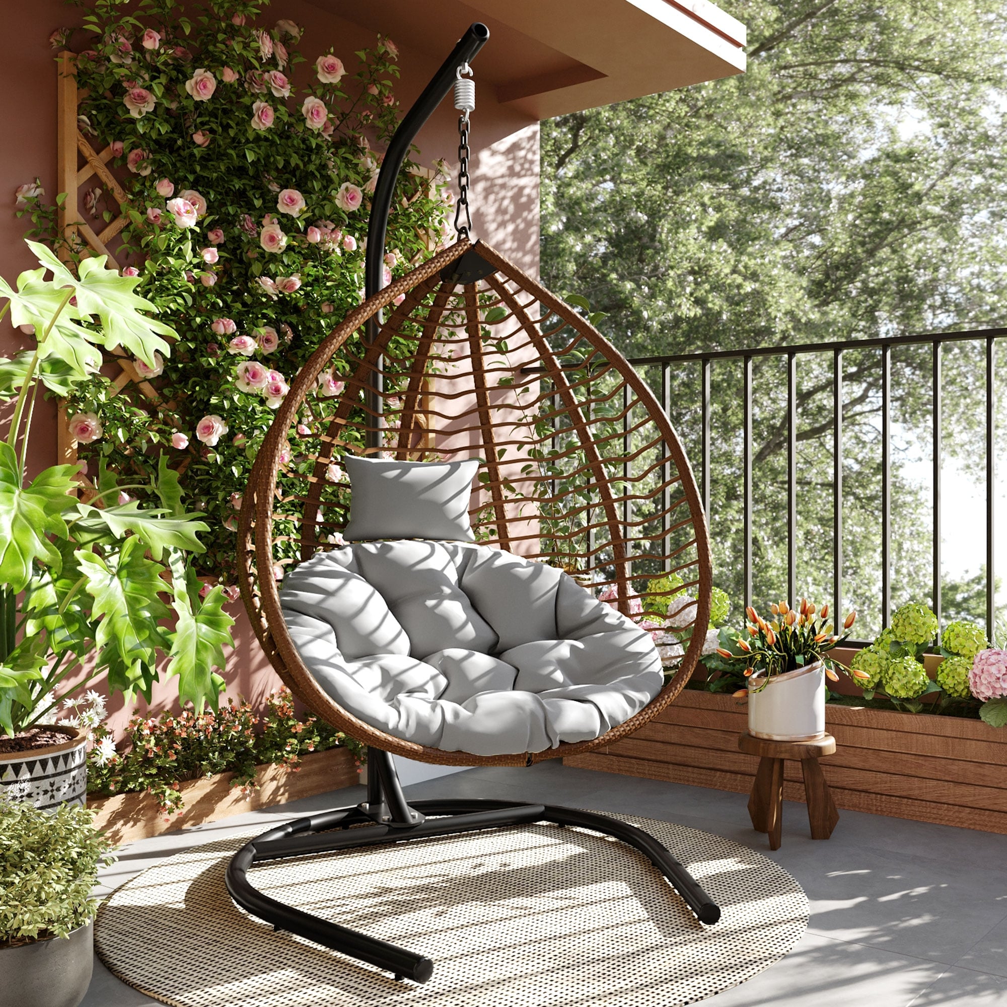 Made from woven HDPE rattan, this swing chair is built to last.