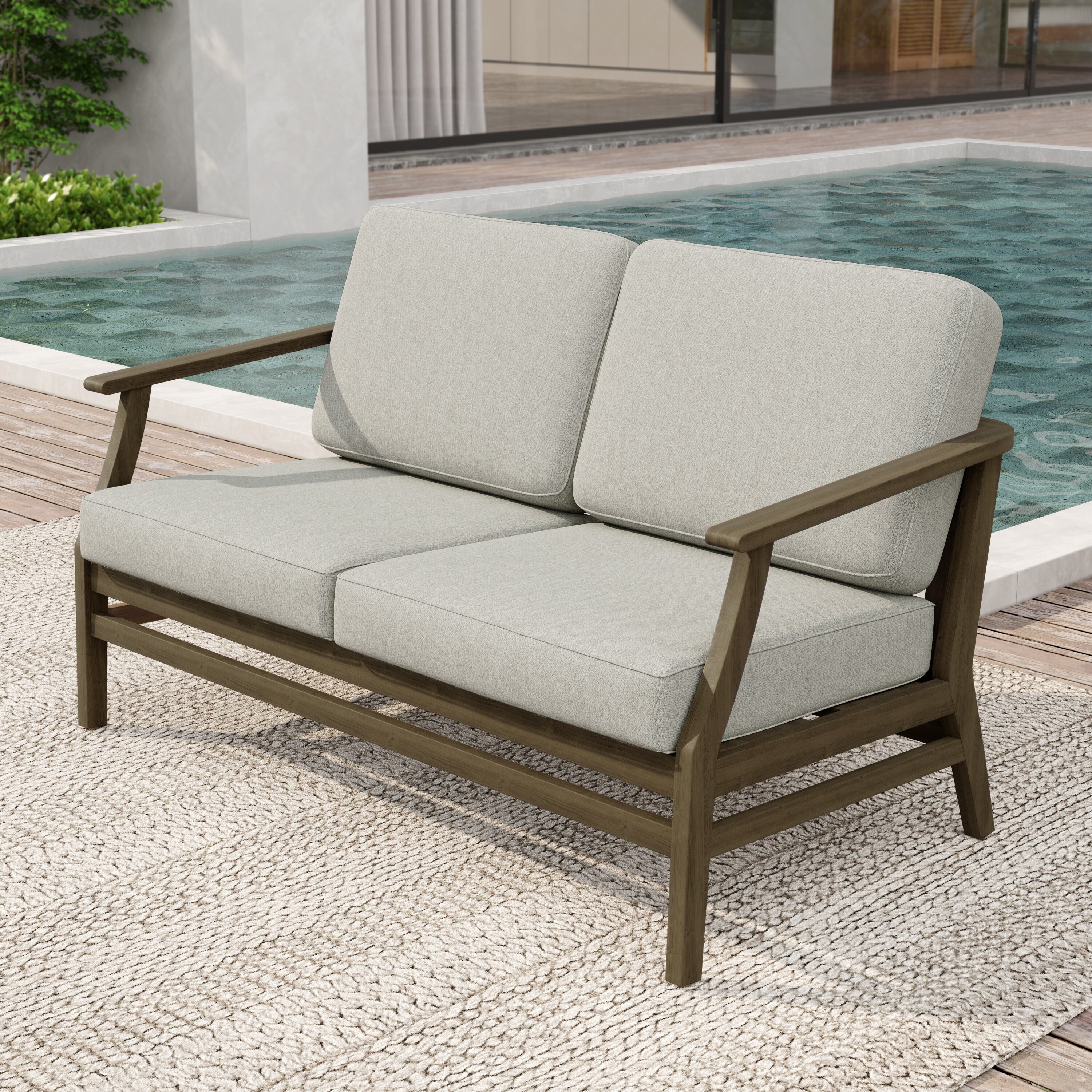 Elevate your patio with this sophisticated outdoor loveseat, designed for daily comfort and enduring style. The frame, crafted from solid teak wood, ensures reliable support and holds up to 400 lbs with ease.