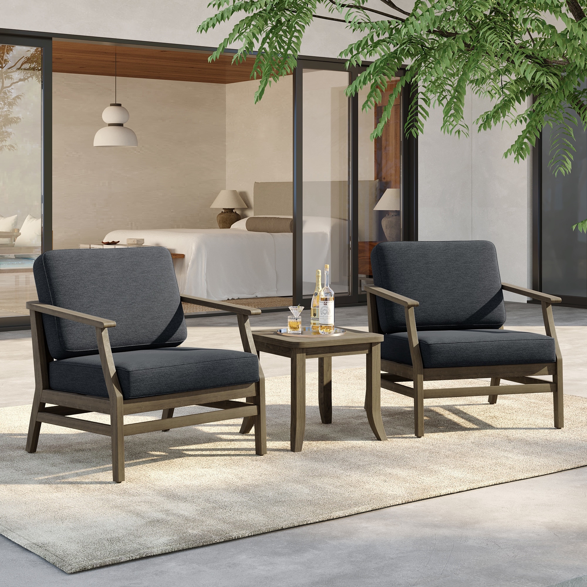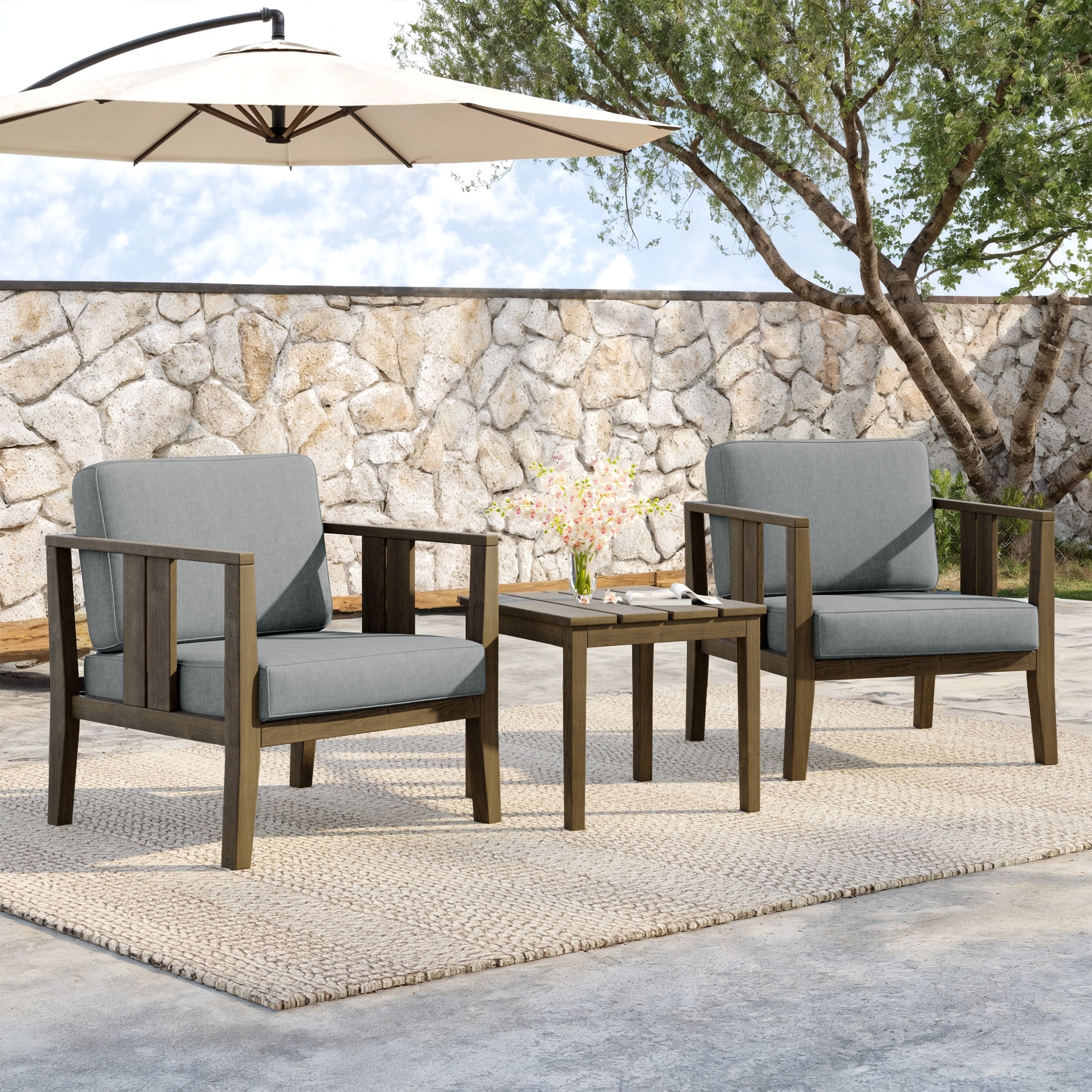 Elevate your outdoor living space with this thoughtfully coordinated three-piece seating set, featuring two armchairs and a matching side table crafted from premium solid teak wood for exceptional durability and outdoor performance.