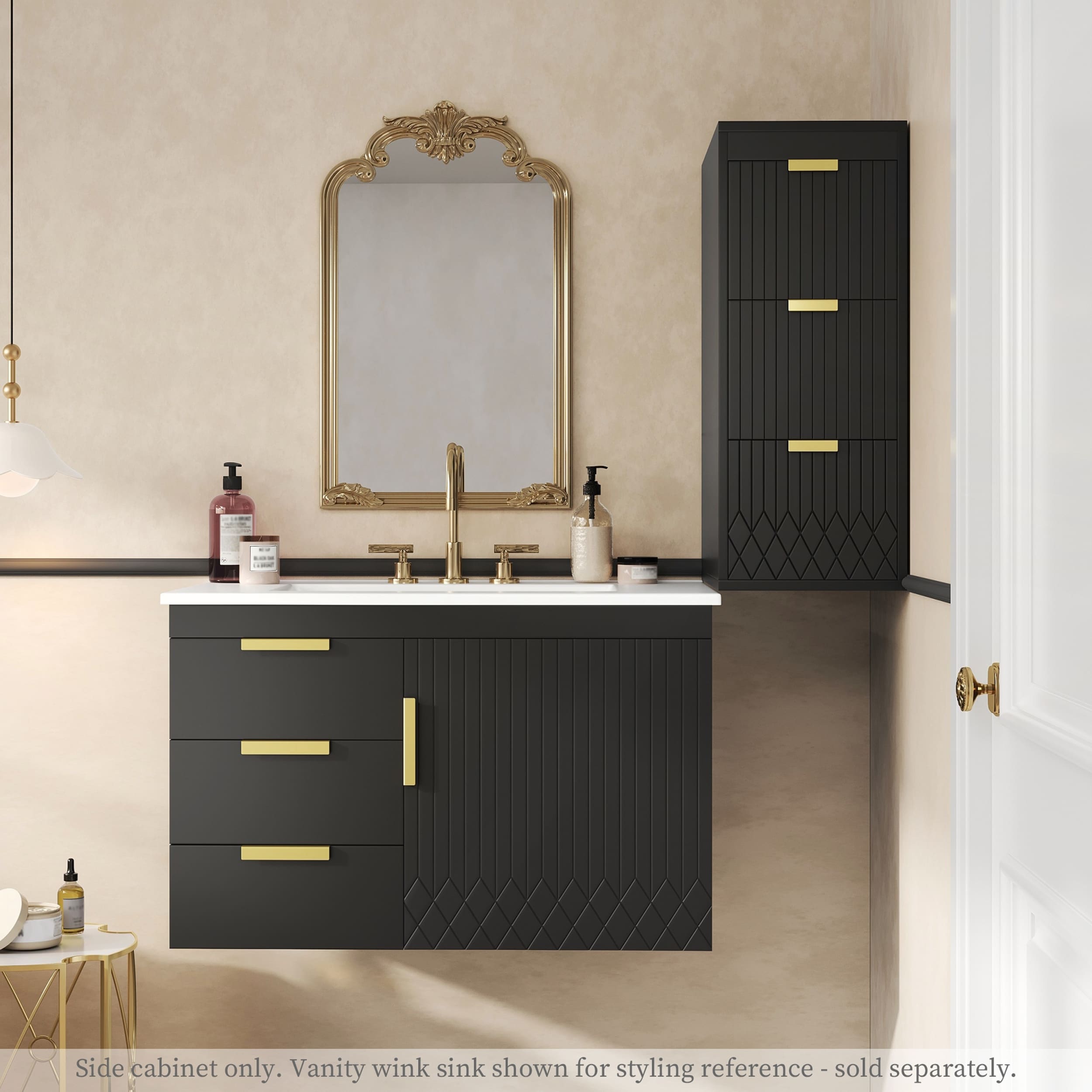 Product Features [A Modern Storage Solution] Elevate your bathroom with this stunning L-shaped handle side cabinet, a sleek and functional storage piece meticulously crafted for modern living.