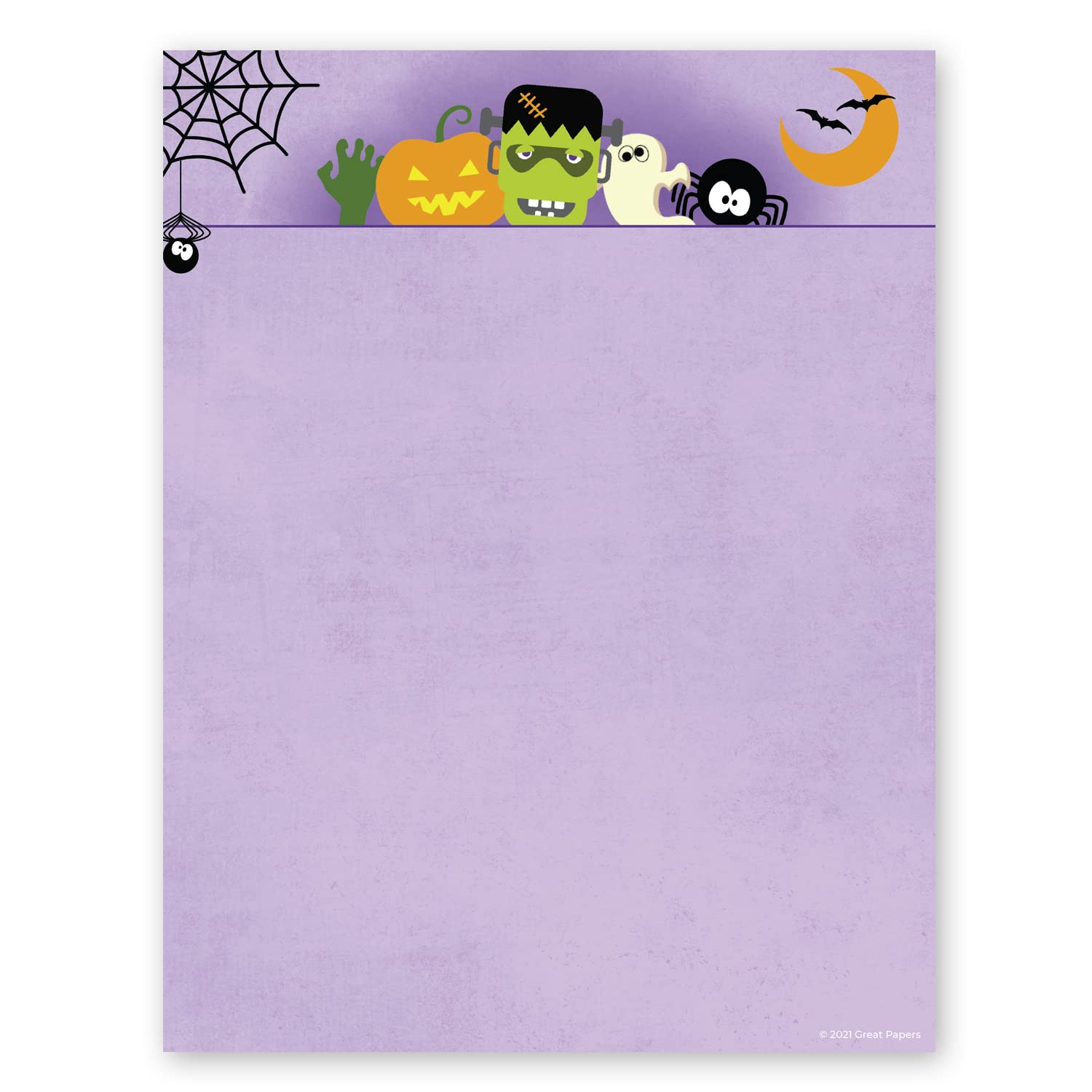 Includes: 50 Sheets of 8.5" x 11" decorative letterhead. Standard Size: Letter size paper is compatible with standard #10 or A9 envelope. Easy to print and send. Cheerful Design: Celebrate the season on this bright and bold illustrated letterhead. This spooky letterhead features fun illustrations of pumpkins, ghosts, Frankenstein, bats, and spiders. Perfect For: Use this delightfully vibrant design to complement your holiday party or advertise sales and promotions! Great for business or personal use. Printer Friendly: High quality stock is printer friendly and compatible with most home or office printers. Wish your friends a happy Halloween with this bold colorful letterhead! This festive paper design creates a unique October letterhead using legendary monsters and Halloween icons. 50 sheets of standard letterhead size stationery is perfect for your holiday message to family and friends. High quality paper is compatible with most home or office printers. The perfect size for standard #10 or A9 envelopes.