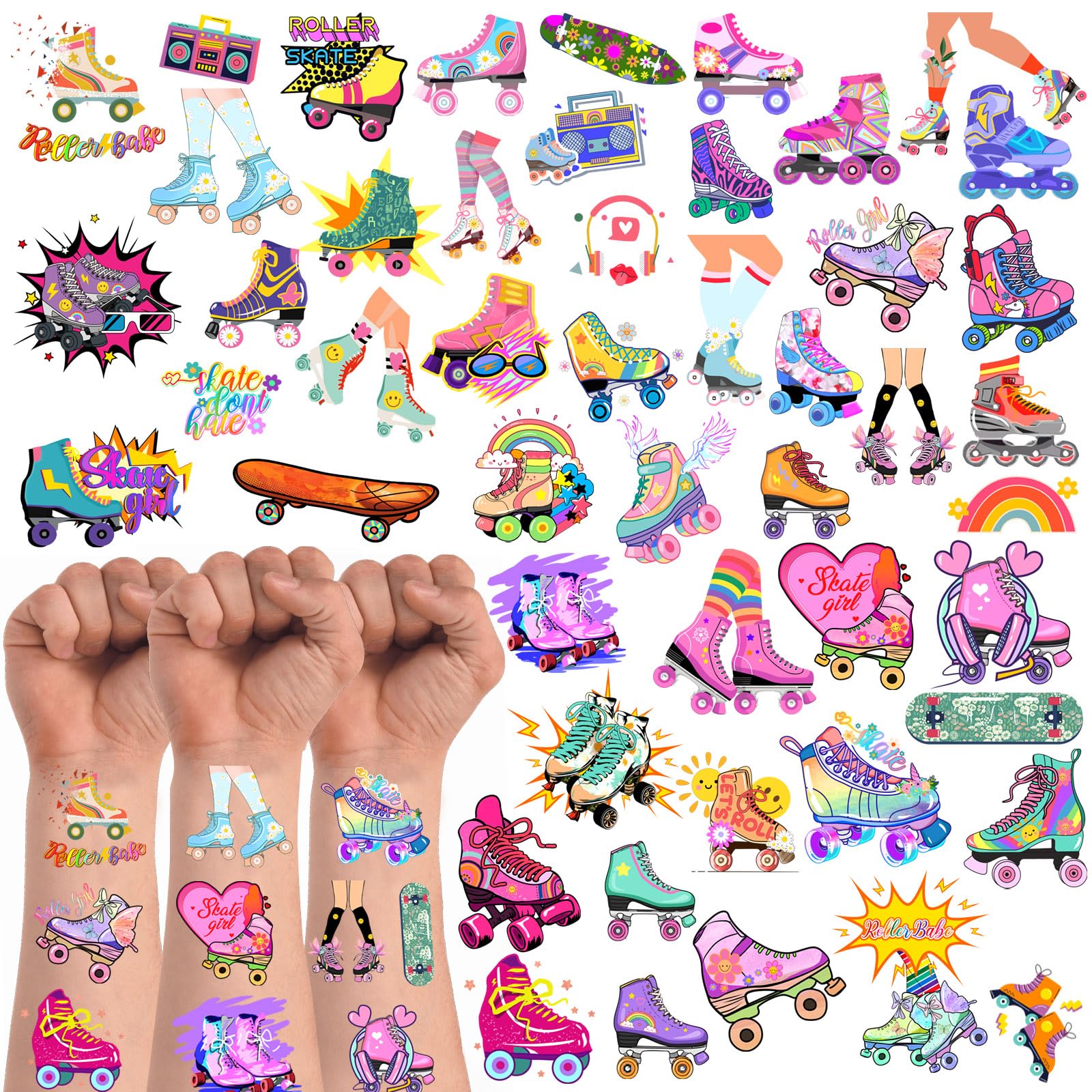 Roller Skate party decorations Package includes 200 pieces of Roller Skate tattoos in 50 styles of Roller Skating themed temporary tattoos, which can be used wherever you want, such as arms, face, and hands Roller Skating Party Decorations Design,20 sheets with 200 pieces of Roller Skate temporary attoos in 50 styles with vividly colorful psychedelic art from Skating Great fun for any Roller Skate party,Such as 80s 90s Retro themed party,birthday parties/DIY decoration/favors, Goodie Bag Fillers,a gift or reward for adults Friendly to Skin Roller Skate party decorations,our temporary tattoos have been put through rigorous party testing and are 100% guaranteed to last all day,Non-toxic, harmless and tasteless, the tattoos do not cause irritation Easy to Use Roller Skate temporary tattoos, Cut out the desired motif,remove the plastic covering film of Rollerskate temporary tattoo,then stick the tattoo face down on the clean and tidy skin,wet the tattoo with water,gently pat and press for about 30 seconds,then tear off the paper Our Rollerskate party tattoos are the perfect goodie bag,Perfect Party Accessory: a fun addition to any picnic, 80s 90s Retro Theme Hip Hop,day in the park,or at home activity