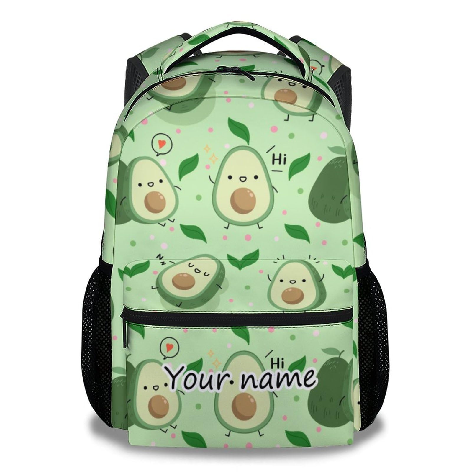 Personalized Design: Elevate your style with our chic and adorable custom backpack. Customize your backpack by providing your name and clicking the "Customize Now" button to have your name printed on the bag and make it truly yours. Large Capacity Backpack: Experience convenience with our large capacity print backpack. This backpack has a roomy interior to hold all your essentials. It has 1 main pocket, 1 front pocket, and 2 side pockets, as well as 4 interior compartment pockets, providing ample space for notebooks, pens, pencils/boxes, and other items you may need. Durable Polyester Material: Our backpack is made of polyester material and designed to withstand everyday wear and tear. This durable fabric is not only breathable but also hardwearing, ensuring your pack will stay in shape for the long haul. This backpack is easy to clean and ideal for any adventure. Adjustable Shoulder Strap: The adjustable padded shoulder strap of our school bag allows you to enjoy a comfortable carrying experience. The shoulder straps are easily adjusted to your preferred length, providing support and lightening loads during all-day activities. Soft foam sponge shoulder pads relieve pressure and enhance breathability and ventilation to make your backpacking experience more enjoyable. Multifunctional Backpack: Our school bag is designed to be versatile, making it ideal for a variety of everyday activities. Whether you're going on a day trip, traveling, hiking, school or camping, this fashion backpack is the ideal companion. Our backpacks for girls, boys, elementary school, middle school, high school and any occasion are designed to meet your needs. Introducing our avocado backpack, which is the combination of cute, stylish, durable, lightweight, comfortable and adjustable. With adorable avocado graphics and a customizable design, it's sure to be a fashion statement, that will make you stand out.