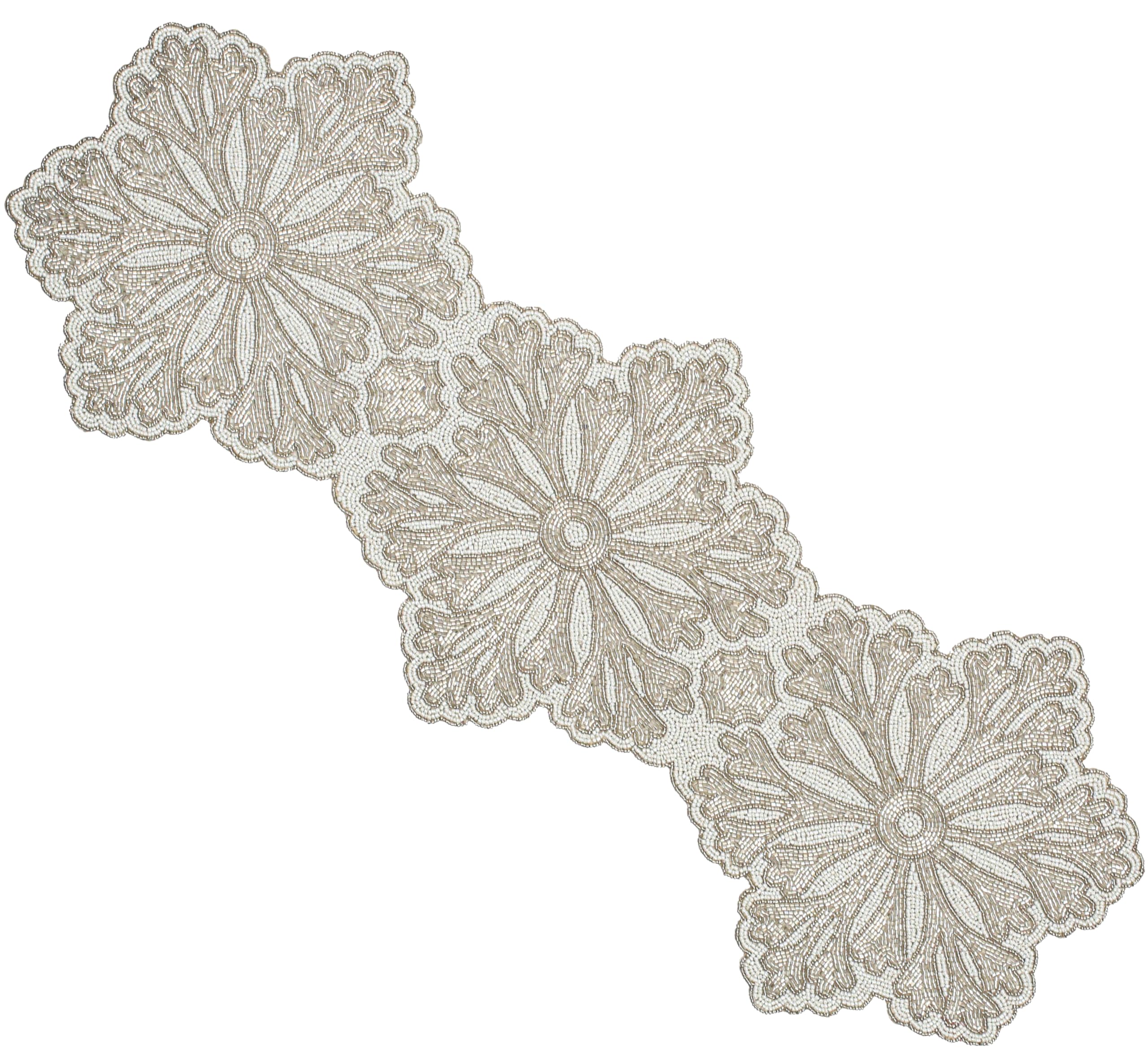 Polyester ✅ MEASUREMENTS & COLORS: This 13x36-inch beaded table runner in elegant white silver adds a sophisticated touch to your décor. ✅ CRAFTED FROM PREMIUM MATERIALS: Made with real glass beads and smooth polyester backing for durability and shine. ✅ PERFECT FOR CELEBRATIONS: Ideal for weddings, Diwali, Christmas, Thanksgiving, housewarmings, and festive table settings. ✅ ENHANCES ANY SPACE: Adds luxury and sparkle to dining tables, consoles, coffee tables, perfect for both daily use and special occasions. ✅ HANDCRAFTED UNIQUENESS: Slight color, size, and texture variations due to artisanal craftsmanship make each runner one of a kind. Beaded Christmas Table Runner,Glitz Table Runner,Gold Beaded Runner,Fancy Table Runner,Handmade Decorative Embroidery Runner for Christmas New Year Family Party Decoration - 13x36 - Cloud White Silver