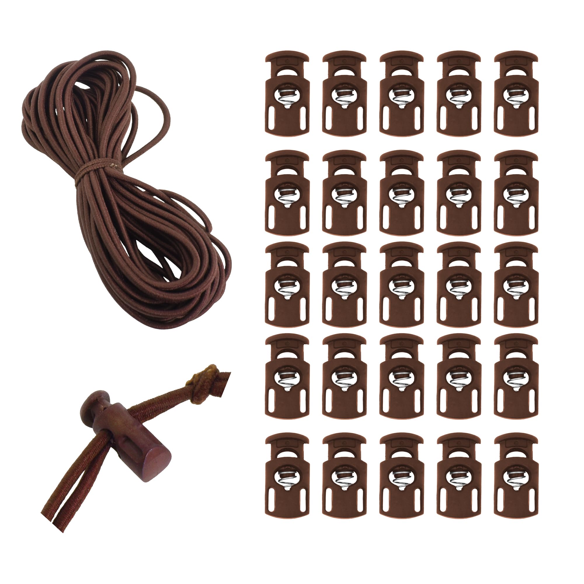 Brown Elastic Cord & Plastic Cord Locks End Spring Stop Toggle Stoppers: The lightweight plastic barrel drawstring clamps and strong elastic rope cord, fit for indoor and outdoor uses, make perfect bungee & toggle spring sord locks for drawstrings. Easy to Install Bungee Shock Cord Lock Stoppers & Elastic Cording: The neutral spring-loaded toggles for drawstring replacement and heavy-duty replacement drawstrings with low moisture absorption and heat-fusible ends are easy to assemble. Drawstring Clips Fasteners & Replacement Drawstring Cord for Clothing: The hardy shock cord is washable & dryable, making great elastic drawstring cord for sweatpants, jogging pants, jackets, hoodies, ski gloves, hats, and elastic shoelaces for boots. Brown Drawstring Stoppers for Jewelry Making & DIY Crafting: The spring toggle cord locks serve as great cord stops for drawstrings for sport gears, tents, lanyards, luggage, backpacks, and bags & single hole cord locks for paracord ropes & elastic bands. Bulk Drawstring Cord Replacement & Draw String Locking Ends: Each elastic cinch cord and lace locks kit includes 10 yards long & 3mm thick round bungie cord string and 25 push cord stoppers for drawstring, which are easy to adjust or slide up and down. Did your spring cord lock on your sweatpants slip too easily? Do your paracord clamps give up after a short term of use? This stretch drawstring with stopper kit is the answer. The abrasion resistant polyester cover can endure harsh weather and frequent use. The stretch cord ends can be whipped or heat treated to prevent fraying. The installation is as easy as stringing the gear with the elastic string, sliding the plastic toggles on, and tying the ends. The non-slip bungee cord lock provides secure hold and can slide easily along the stretchy rope with the top button pushed down. With plenty of quantity included, the drawstring elastic kit will last for several projects. The bungie fasteners are great for boating, kayaking, backpacking, or camping. The string adjuster easily fixes tent poles and awnings, makes trailer and boat covers, ties down tarps, adds loops to bottle holders or hiking backpacks, secures football shoulder pads, adds webs to coolers, or replaces sleeping bag cinch cords. The adjustable cord toggle buckles are convenient to keep around the house to suspend light panels, repair holsters and sheathes, hold chair covers, build cabinet locks or drawer closures, organize cables or extension cords, and even make a boxing reflex ball. For crafty people, the drawstring cord locks can change regular tie shoe strings to convenient elastic shoe laces locks or build hardy zipper pulls. The drawstring clips for pants, shorts, vests, face masks, jackets, pajamas, hats, scrubs, pouches and bags provide secure tie without snagging and also unlock with ease. The uses of the elastic cord stoppers set are so versatile that it can even be used to create fishing rod keepers.