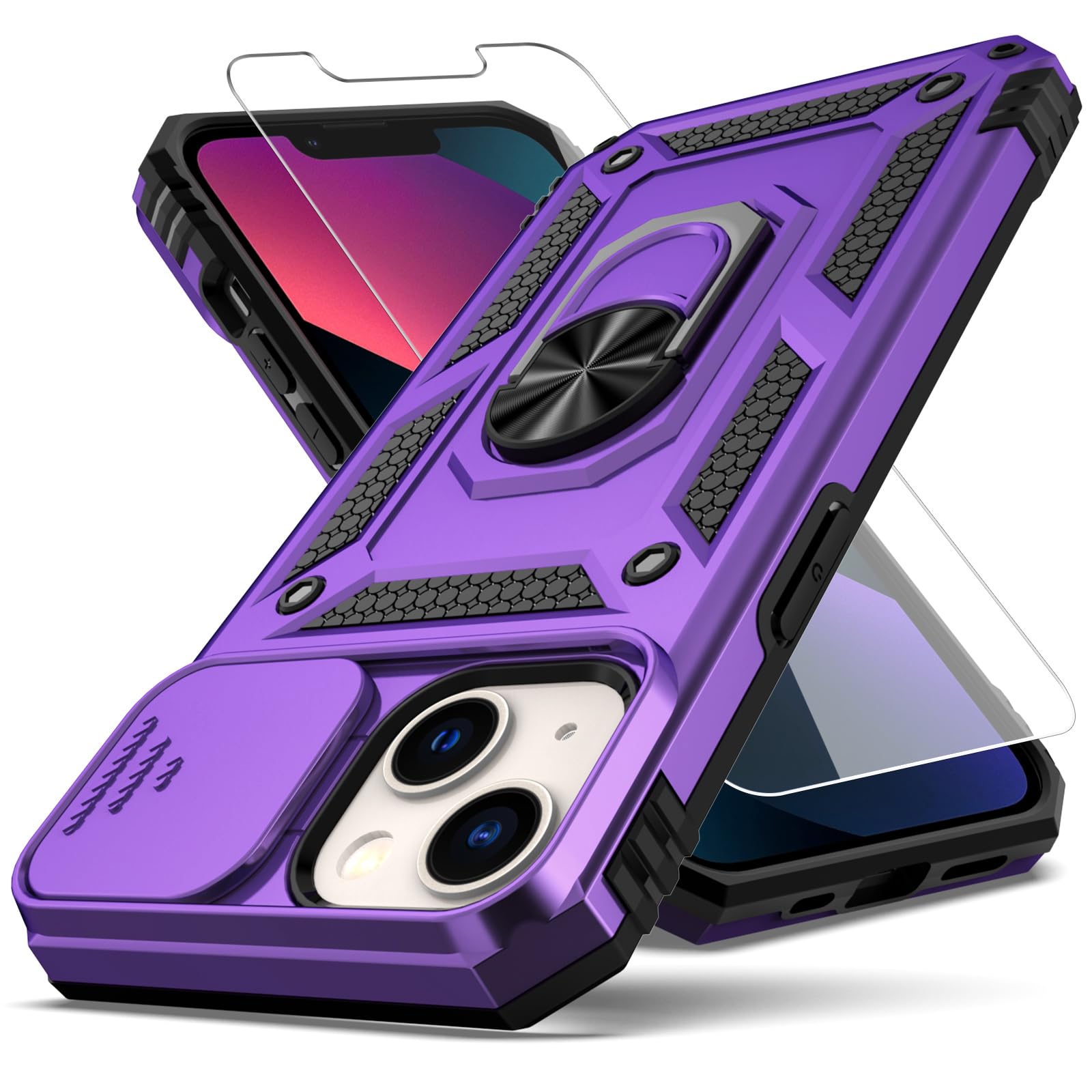 📱【Durable Phone Case】Armor Case with sliding camera cover specially designed for iPhone 13 6.1 inch (2021 released). ⚠️ Notice: Due to the metal ring on the back,the case will NOT work with wireless Charging function. 👍【Perfect product design】Two - in - one case, consists of comfortable TPU and hard PC, the two are closely aligned, escort your phone. All buttons and interface user-friendly design to avoid frequent disassembly. And the case perfect cutouts for speakers, camera and charging hole allow you to easy acces. 👍【Military Shockproof Protection】Double layer shockproof case made by TPU+PC.This multi-layer cushion structure provide additional shock absorption protection. slide camera cover design protects and hides the camera perfectly. 4 highly strength shockproof corners and raised lens and screen lips keep your phone from scratching and breaking when dropped. It's a good choice for sports and outdoor activities. 👍【Magnetic Ring Kickstand】Newly upgraded multi-function case built-in ring kickstand and metal patch.360°rotating ring provide two stand modes for vertical horizontal viewing,so it can be used as ring holder and release your hand when watching video.The Metal Patch back easily attach to magnetic car mount,very convenient during driving time for navigation.You will love how convenient it is with such powerful functions. 🎁【Warranty Service】Package come with 1 pack case and 1 pieces PET HD Screen Protector (Plastic). YZOK provides you warranty service. If you have any problems with our products, please contact us via Amazon Seller Center at soon.💗 We will reply timely. for iPhone 13 Dual Layer with Swivel Ring Car Mount Kickstand Hybrid Hard PC Soft TPU Protective Case