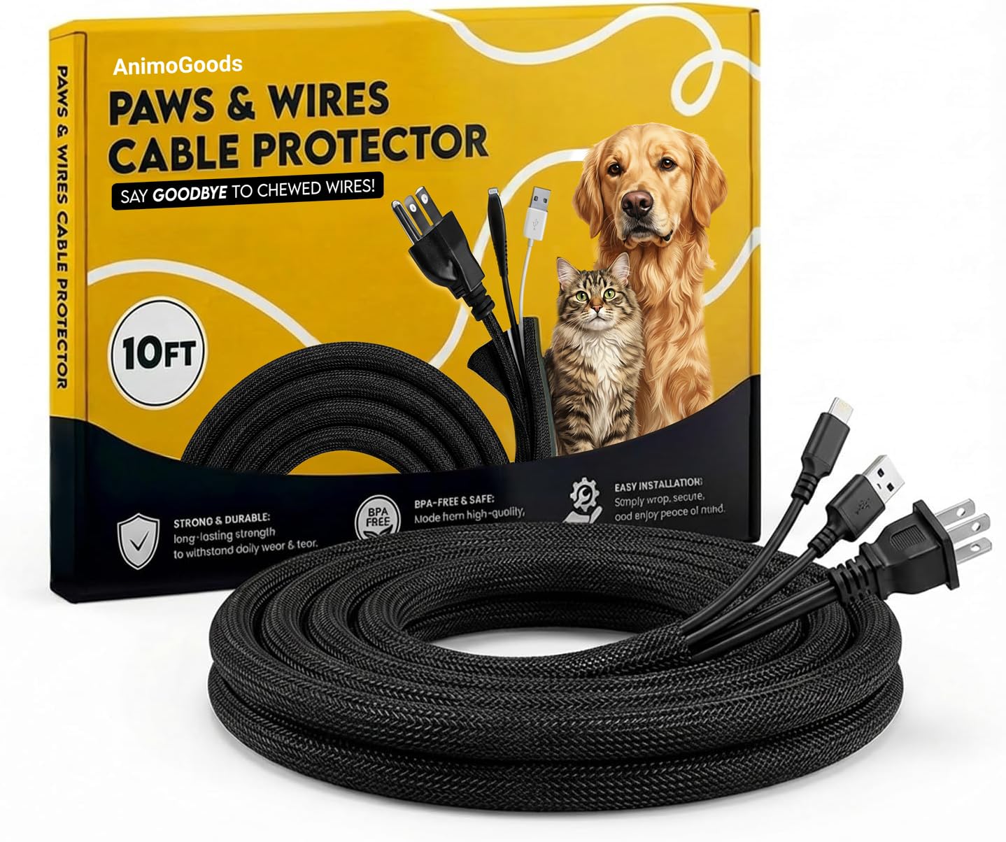 Strong Anti-Chew Protection: Crafted from durable PET material, this wire protector for pets provides excellent resistance against chewing and scratching, safeguarding your cables from pet damage. Easy to Customize: This 10-foot long sleeve can be easily trimmed to the perfect length, allowing you to create the ideal cat cord protector for your needs. Simple Installation: With its open design, sliding cords into the sleeve is quick and effortless, offering a hassle-free setup for these cord covers for pets. Pet-Safe: Made from non-toxic materials, this cord protector keeps pets safe while preventing them from chewing on electrical wires. Convenient Access: The open design allows easy access to any part of the cord without removing the whole sleeve, making it easier to keep cats from chewing cords. 30-Day Satisfaction Guarantee: Backed by a 30-day satisfaction guarantee, offering peace of mind with your purchase of reliable cord protectors from pets no chew. Introducing Paws & Wires Cord Cover: crafted from durable PET material, 10ft in length, and sleek black in color. Keep your electrical cords safe from pets' chewing and tugging while maintaining a tidy home environment.