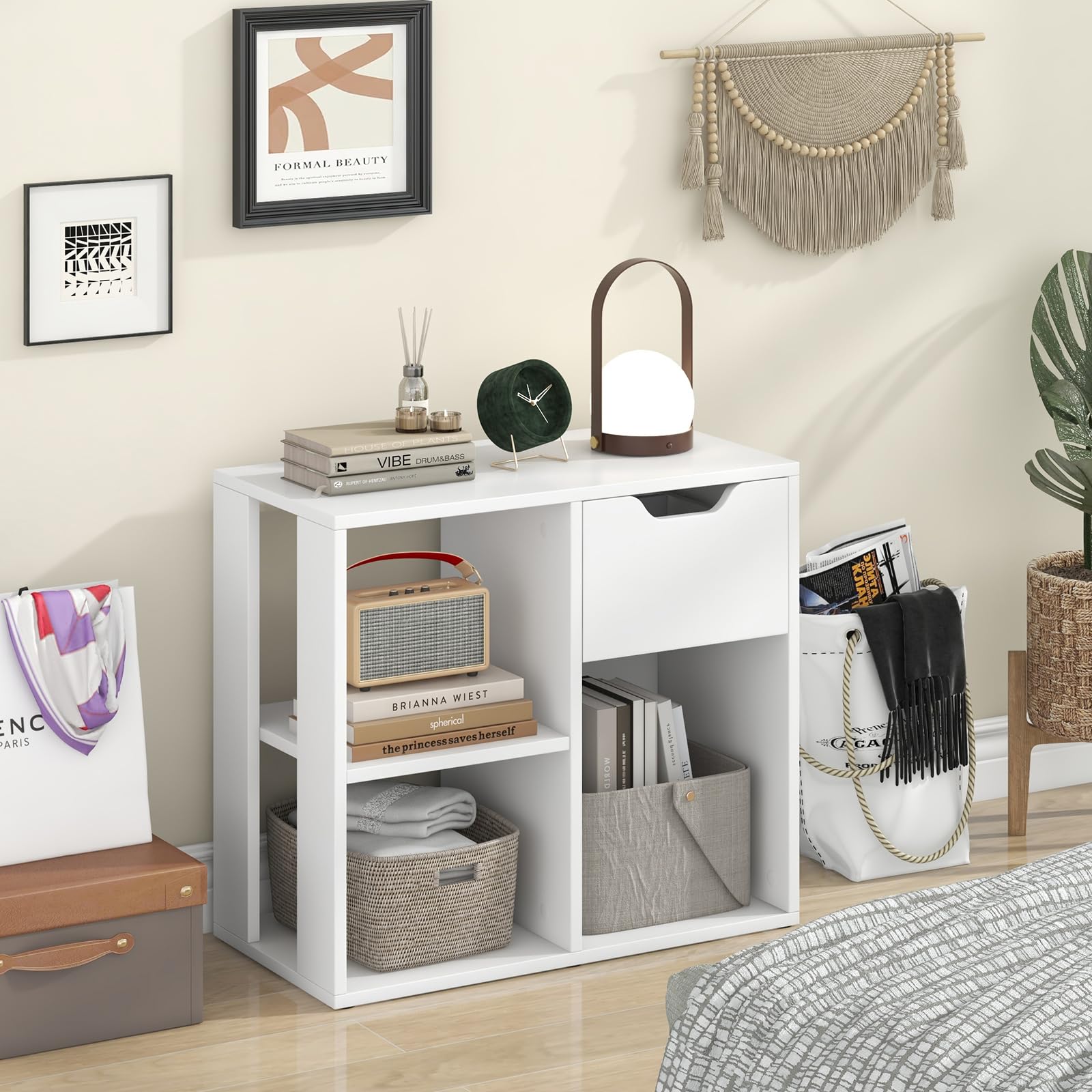【Night Stand with Charger Station】Add 2 AC outlets, 1 USB port and 1 Type-C port, more charging spots for bedtime, plug in your phones and turn on your lamps, this nightstand with drawer will comfort your bedtime with convenient charging. Plus: Contain patent pending drawer slide 【2 Drawer Nightstand】2 fabric drawers and an open shelf on the side table with storage offer lots of space to stash your bedside items, like books, devices, and remote... A tidier bedside space awaits 【Multiple Use Occasions】The sleek outlook design makes this side end table easily immerse into any home room. Place it beside the sofa as a narrow side table, set it up as a bedroom nightstand, or put it in the apartment as a storage end table... its functions make it go beyond 【Solid Structure】Crafted with P2 particle board, reinforced by a robust powder-coated steel frame, 2 durable non-woven fabric drawers, and balanced by 4 adjustable feet, this side tables living room will serve a long time 【More Use, Less Hassle】Comes with detailed instructions, provided tools, and numbered components, the assembly of this bed side table is without much hassle. After a while, this end table can be used as a living room side table, couch side table, storage table ... Experience the convenience of charging your devices at your bedside with this modern nightstand. Comes with 2 AC outlets, 1 USB port and 1 Type-C port, and now you can easily plug in your phones, tablets, and other devices.