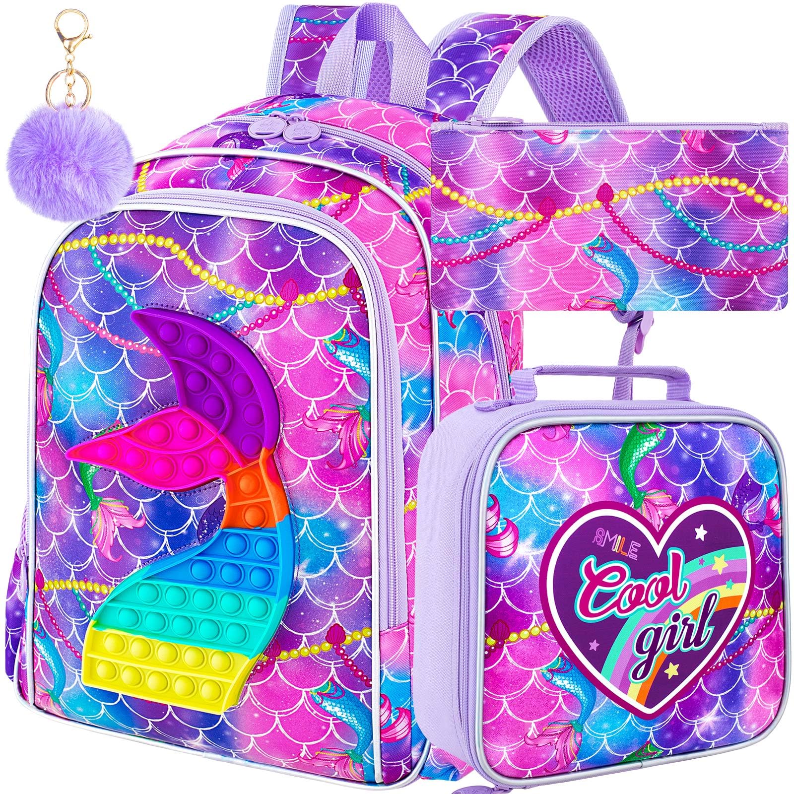 Girls Backpack 3 in 1: Mermaid Backpack + Lunch box + Pencil bag, atractive fishtail design , delicate polyester+UV material, smooth zipper, wider and thicker straps take the pressure off your child's back. Mermaid Press Bubble Design: The mermaid shape on girls backpack is constructed by press bubble design, kids can enjoy the fun of pressing, and effectively relieve anxiety and stress. Water Resistant and Reflective Design: Our kids backpack is made of high quality fabrics water resistant material on surface and design with reflective strips on the front to protect your kids safe. Kids Backpack Set Size: The girls bookbag set including backpack: 12"(L)x16"(H)*5"(W), lunch bag: 8.5"(L)*9.5(H)*4"(W) , Pen bag: 8.6"(L)x4.7"(H)*0.2"(W). Large Capacity: This school backpack for girls is with a big roomy main compartment which fit for for A4 tablets or standard folders, a big front pocket and 2 side pockets. Meet children's needs.