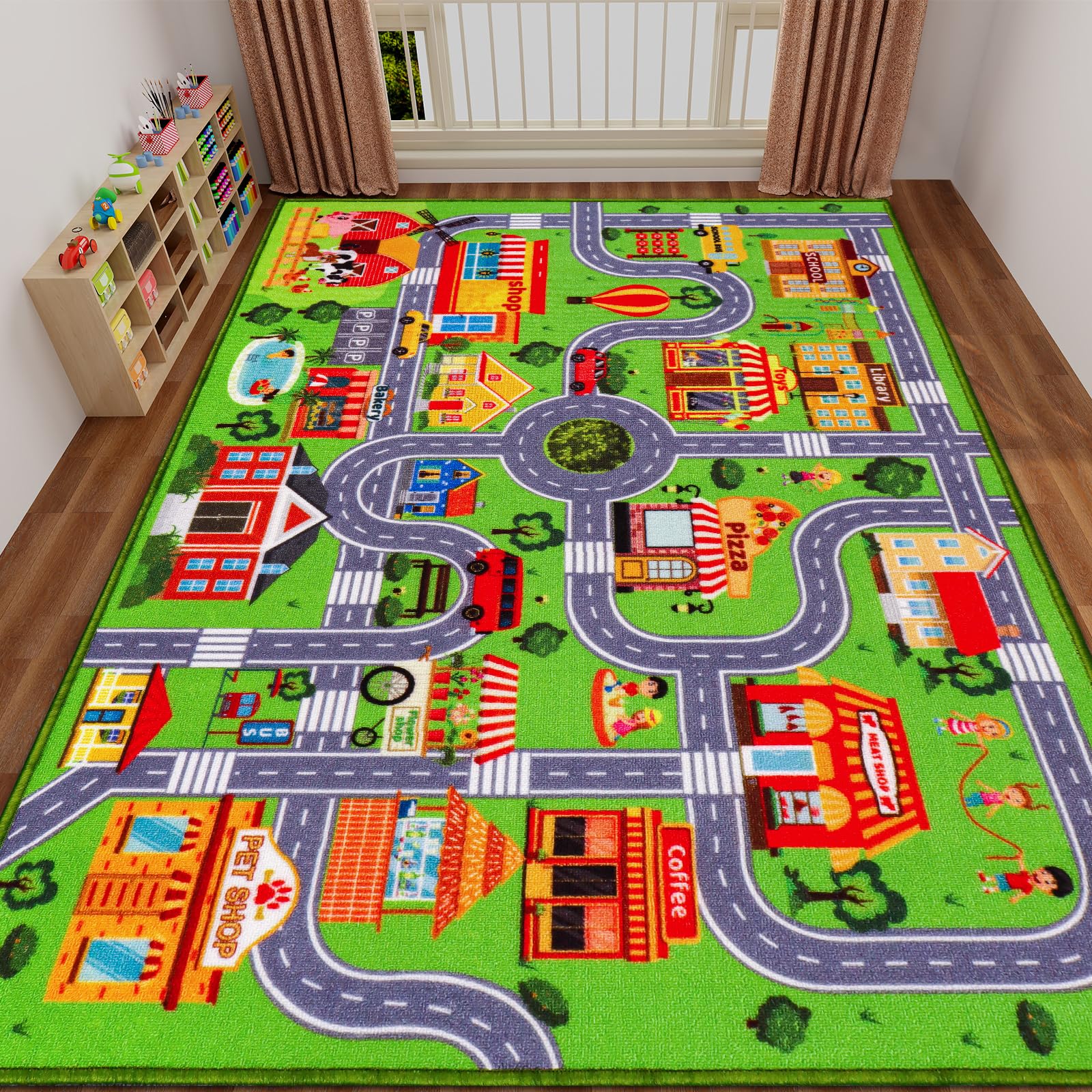 City Life Traffic Road Car Play Rug: Our city map rug includes traffic roads, schools, farms, gas stations, firehouses, hospitals, shops, police, and more buildings. Perfect for kids who love to play with cars, trucks, ambulances, or firetrucks. Now your little boy can have his own city! Educational Learning Area Rug: This car rug is perfect for kids to learn about city buildings, locations, and seasons. Kids will love driving his car to see every route in the city,also help kids explore fun and active approaches to boost their vocabulary development,motor skills and role-play skills. Premium Quality And Easy Clean: Kids Carpet is low pile surface with non-slip backing. Non-toxic, Non-BPA, and lead-free durable ABS plastic, it's very safe for our kids. Easy to clean, using vacuum to clean it regularly or machine washing to clean the rug completely. GREAT GIFT: if you are looking for a fun, educational and practical gift for your son, daughter, nephew, niece, grandson or granddaughter, you should look no further! our car track rug will make the ideal birthday, name day, thanksgiving, Christmas or holiday present for any child! KIND TIPS: Due to the nature of carpet materials and manufacturing processes, it is possible for hook and loop fasteners to snag or catch on the carpet fibers. To address this issue, simply use a Fabric Shaver and gently run it over the affected area. This will effectively remove the snags, leaving your carpet looking smooth and tidy. Providing a 100% satisfaction experience is our main priority to our customers. Feel free to message us through “contact sellers” if this kids rug doesn't meet your expectations. Kids Carpet Car Play Rug, City Life Traffic Road Kids Rug Playmat,Non Slip Children Educational Game Car Mat Area Rug for Playroom Baby Toddler Boys Bedroom Classroom
