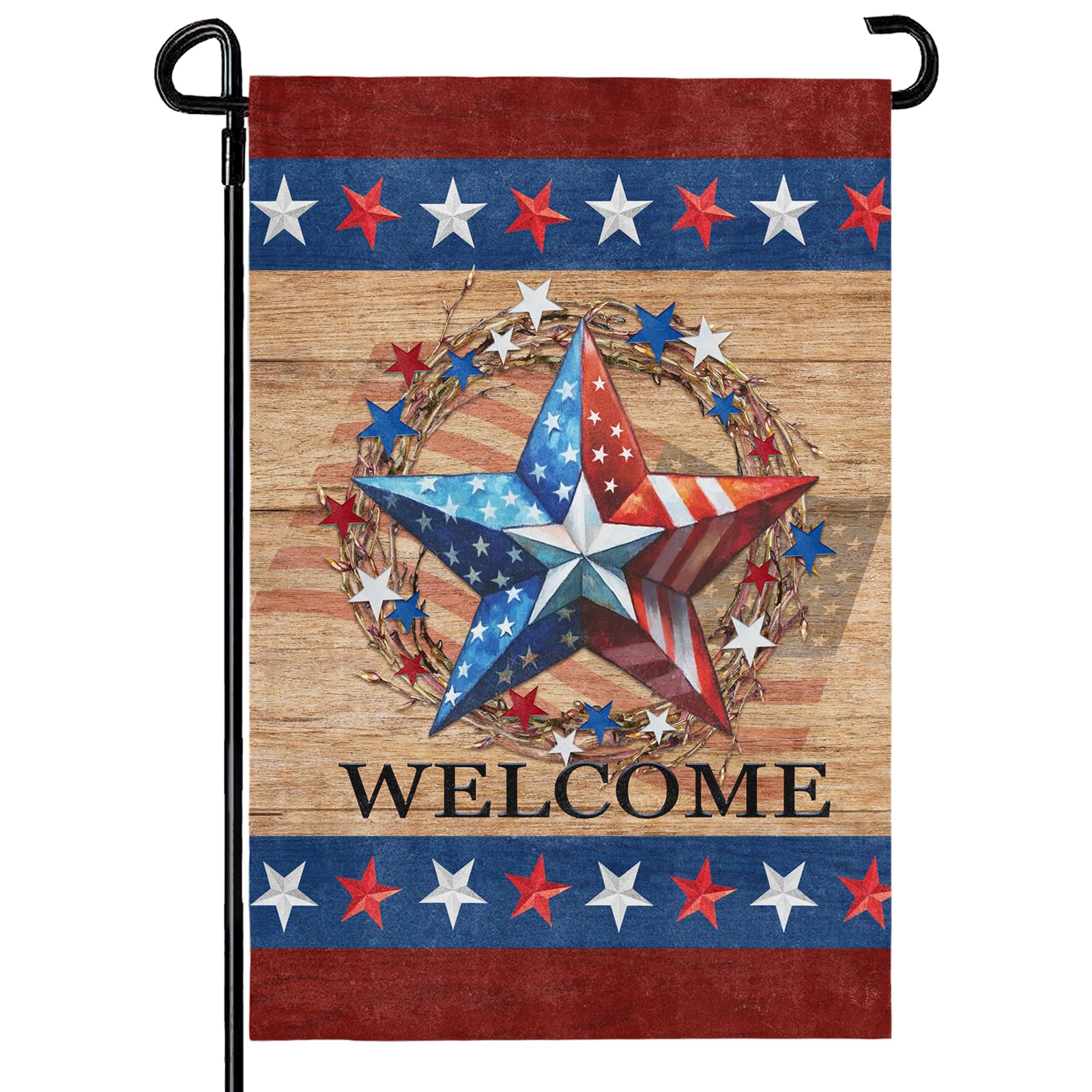 4th of July Garden Flag Size : This fourth of july garden flag is 12"x18" (30 x 45 cm) that fits many garden flag poles Material : This patriotic garden flag is made of good polyester material that is weather and UV fade resistant,and it will last all season in the sun Double Sided : The july 4th garden flag is designed with barnstar with usa flag, which is printed on both side , it is colorful , vibrant and lively Include : Only one welcome garden flag , garden pole or stand not include Occasion : This outdoor garden flag is used for any deck , patio , porch or veranda and make charming decorative statements for any backyard , lawn or garden
