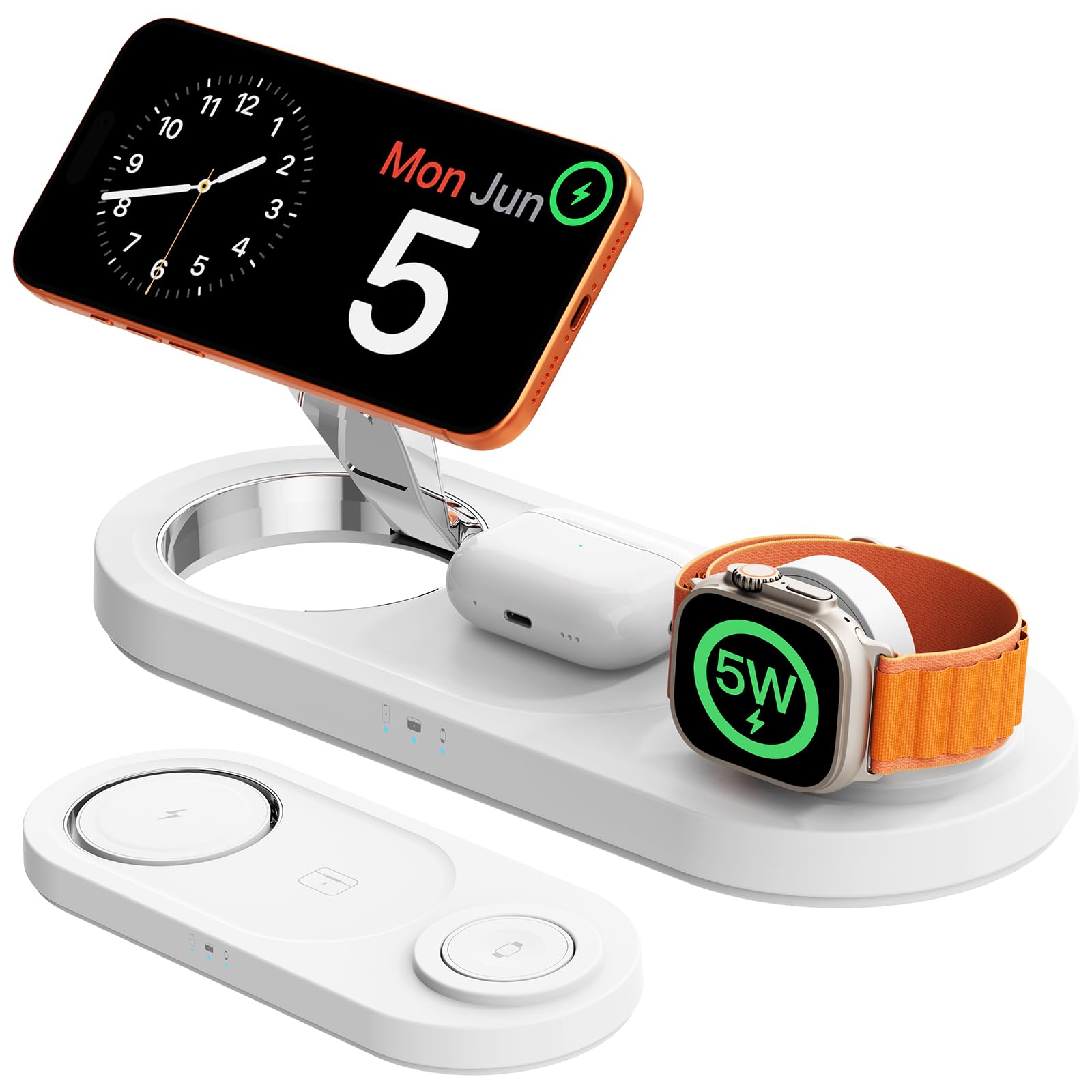 【3 in 1 Wireless Charging Station】 : Designed for users of products, wireless charging allows you to charge for watch & Airpods simultaneously with just one cable. With a built-in wide-range induction coil and wireless charger technology, it brings you an easy and convenient charging experience without the hassle of cluttered wires. Note: Please do not wear a case thicker than 5mm(0.2")& Please update the system of the device promptly. 【Wide range of compatibility】: Wireless charger phone charging position is no magnetic suction function, but supports wireless-enabled charging devices, it applies to iPhone17/ 16/15/14/13/13/12/11/13/12Mini/Pro/Pro Max/XS/XR/XS MAX/X/8/Plus/And-roid Samsung series (note that only wireless charging devices are supported); Watches and headphones are only supported on i Phone models for iWatch 10/9/8/7/6/5/4/3/2/SE/Ultra/Ultra 2 and Air Pods 2/3/4/Pro/Pro 2 (note: Air Pods are only compatible with wireless charging cases) 【Portable Folding Design】: Apple charging station with foldable and lightweight design, can charge up to 3 devices at the same time, non-slip surface ensures that your device stays in place during charging, ideal for home, office, travelling, it provides fast and reliable power supply, easy to put in your bag, i Phone wireless charger say goodbye to clutter and hello to efficiency. A thoughtful gift for your loved ones/friends 【Anti-Slip and Sleep-Friendly Indicator】There is a silicone pad in the base of charging station,The indicator light on the charging station displays the charging status of the phone. When the phone is placed on the wireless charger, the indicator light will turn on. After 20 seconds, the indicator light will turn off while the device is charging normally, so it will not disturb your sleep at night 【Multiple Protection of Wireless Charger】: The wireless charger is F-CC certified with overcharge, overvoltage, overheat protection and foreign object detection. The back of the charging station is also equipped with cooling holes, which can quickly dissipate heat and effectively improve the charging efficiency, equipped with an 20W fast charger adapter, which can protect your device from overcharging damage and ensure charging Portable:It is made of ABS fireproof material, the 【What You Get: The package includes】(2025) Wireless Charger Stand*1, 20W PD Adapter*1, USB Type C Cable(1m/3.3ft)*1, User Manual*1. Besides,LYAOAO pays attention to quality issues and ensures that the magnetic suction wireless charger you receive has undergone a series of quality testing processes, Enjoy peace of mind with our 3 years limited warranty, ensuring you won't worry about returns. If needed, we will provide solutions 3-in-1 magnetic suction wireless charger Fast charging up to 18W,150 minutes full 100%,25% faster than peers High safety performance Supported Devices: 1.[For Phone] iPhone Air/ iPhone17/iPhone 17 Pro/iPhone 17 Pro Max/iPhone 16/16pro/16pro Max/ iPhone15/iPhone 15 Plus/iPhone 15 Pro/iPhone 15 Pro Max/iPhone 14/ iPhone 14 Pro/iPhone 14 Pro Max/ iPhone 14 Plus/ iPhone 13 mini/ iPhone 13/ iPhone 13 Pro/ iPhone 13 Pro Max/ iPhone 12 mini/ iPhone 12/ iPhone 12 Pro/ iPhone 12 Pro Max 2.[For Watch] UItra 2/UItra/9/8/7/6/ SE/ SE 2/ 5/ 4/ 3/ 2 3.[For AirPods] AirPods 2/ AirPods Pro/ AirPods 3 4.Perfectly compatible for professional magnetic phone cases