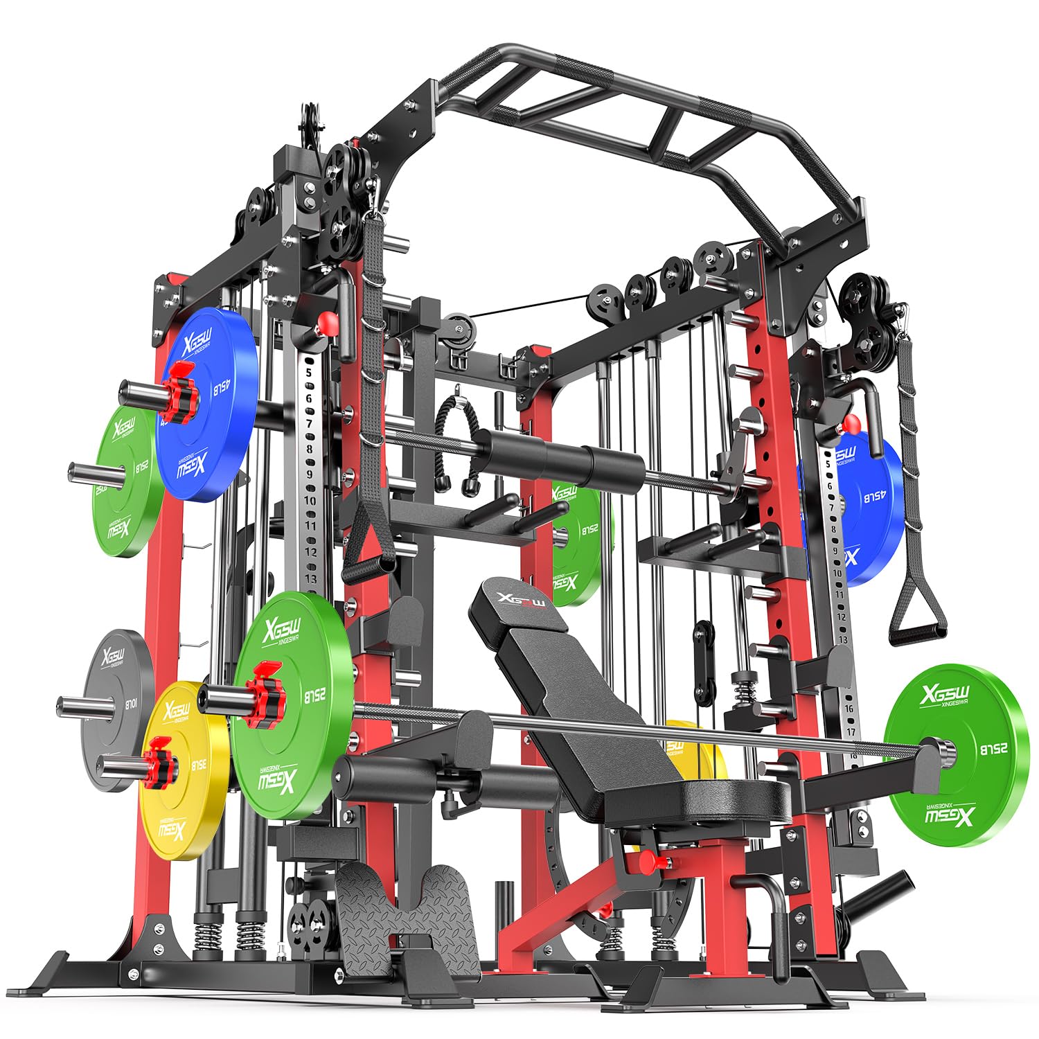 [2024 New Design]XGSW XINGESIWR 2024 Power Cage L05 can provide more muscle training and true home fitness without adding more accessories. [About L05]:Olympic pole length 90.3".The footprint is 65.47" L x 68.58"W x 84.64" to 88.5"H, enough depth ensures perfect operation of bench press and deep squat to improve the comfort and safety of exercise. After repeated tests and experiments, L05 can carry up to 1500lbs in training and still maintain high stability [Full Home Gym Workouts]Equipped with a multifunctional fitness rack that perfectly combines a weight rack, squat rack, cable crossover machine, dumbbell bench, barbell bar, and practical extra accessories, you can perform a full-body workout at home, such as cable flyer, push-ups, rowing, squatting, bench press, biceps flexion, triceps extension, pull-ups, and so on. [Safe and stable]L05 After experiments and tests, we upgrade his functions and optimize the details on the basis of the original to meet the user's needs and the use of safety, so that you can ensure the safety and comfort of the product while exercising. [Easy to install]Each parts of the equipemnt has it own designated number, the designated number related to equipment number can be used to installation. easy to move and convenient to install. [XGSW XINGESIWR Support]The Home Gym Package comes with a 24-month basic warranty on the main steel frame and a 12-month basic warranty on the accessories. Easy to install, comes with instruction manual, installation video and all necessary hardware. If you have any questions, please feel free to contact us to give you a satisfactory service. It is a combination of power cage, cable crossover machine, cable station, and pull-ups. Let you do unlimited exercises in limited space!