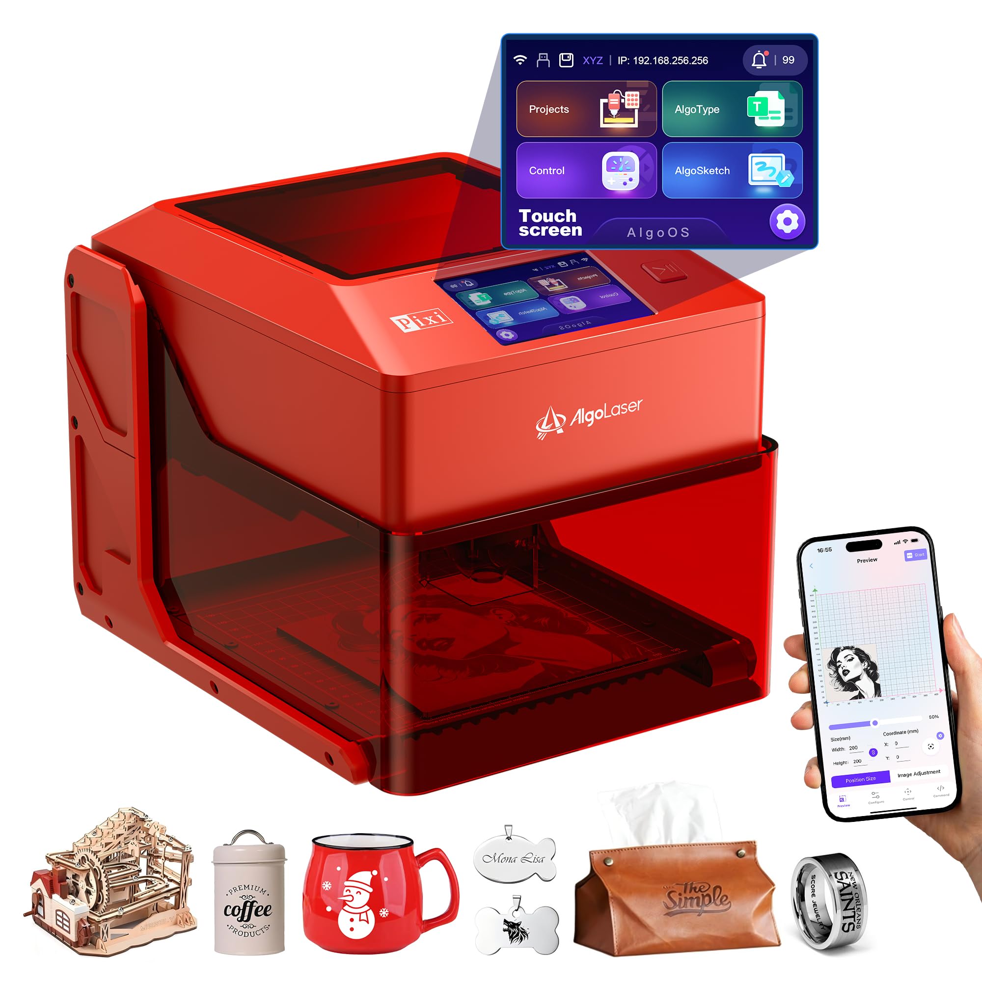 Beginner-Friendly: Portable all-in-one Desktop Laser Engravers with no installation required-perfect gift for your loved ones. Built-in system, multilingual support. 3.5" touch screen allows direct operation without a computer. Supports OTA updates, automatically detects version updates, and keeps the device up to date at all times. Smart Programming & Compatibility: Our Mini Lazer Engraving Machines comes pre-installed with hundreds of online-updatable engraving examples. Supports creating and saving DIY projects. Fully compatible with LightBurn and LaserGRBL software for flexible and efficient engraving. Multi-Functional: Equipped with a 48W power system and 3W (3000mW) laser output, it is a tool capable of stable and precise engraving. Supports Type-C connection, WiFi control, mobile remote, and SD card input. Works with flat, roller, and jaws accessories for various engraving needs. Safe & Widely Applicable: Opening the safety guard pauses operation; closing it resumes normal functioning. The laser engraver automatically alerts when tilted and handles minor malfunctions autonomously. Wear safety goggles during operation. Ideal for home DIY, education, small businesses, crafts, and custom gifts. Capable of engraving and cutting over 300 materials. Exhaust System for Smoke-Free Environment: The Pixi automatically removes smoke during operations. For indoor use, an optional smoke purifier is available for a cleaner workspace.The removable honeycomb platform allows you to work on larger surfaces such as tables and chairs.