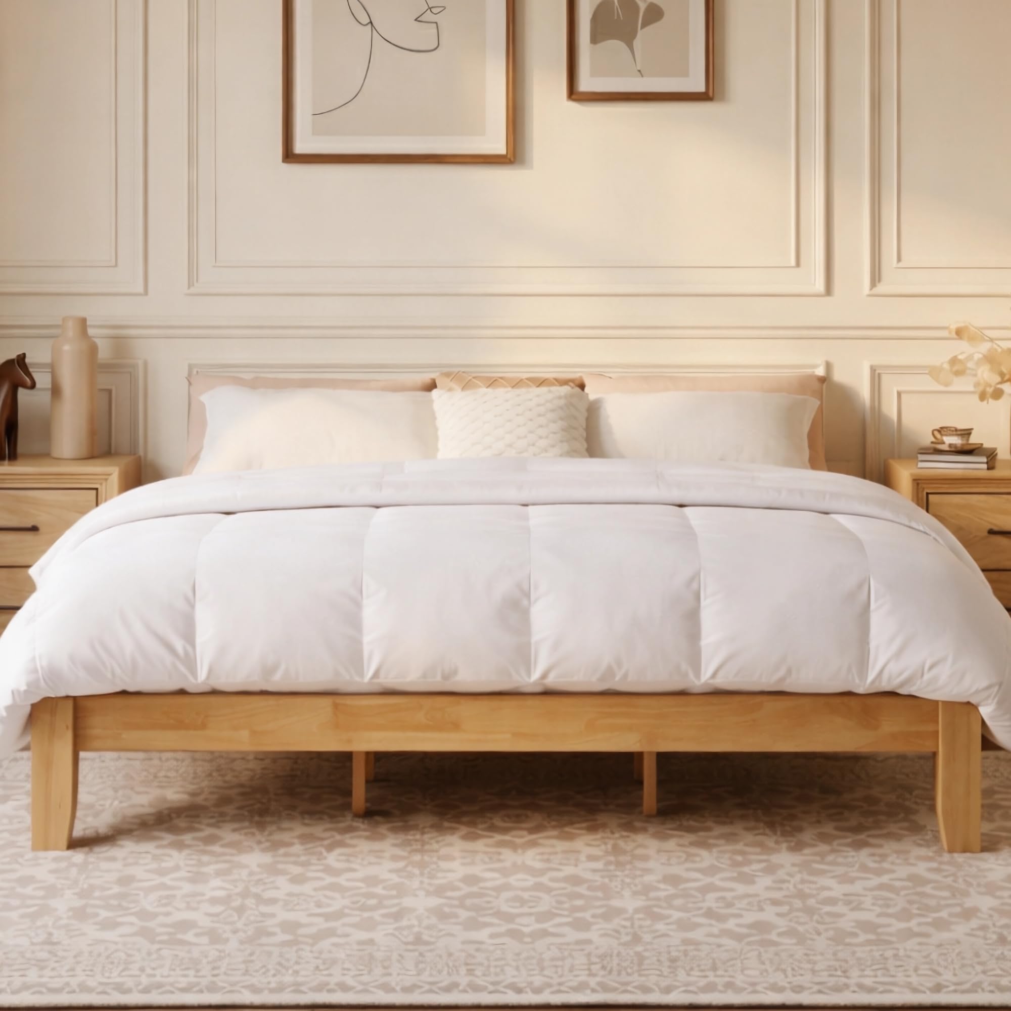【Japanese Joinery – 15-Min Tool-Free Assembly】– Built with traditional Japanese joinery, this bed frame requires no tools, no metal parts—every piece locks firmly into place by hand. Set it up in as little as 15 minutes, perfect for new homes, apartments, or anyone who moves often. The structure assembles and disassembles effortlessly, making your bedroom upgrade smooth, modern, and stress-free. 【1500-Lb Stability with Zero Noise】– Built for absolute stability and total quiet. Thick 3.1" solid wood legs combine with a reinforced, interlocking frame to deliver rock-solid support up to 1500 lbs—without a hint of wobble or creaking. Even when you shift positions, sit at the edge, or share the bed with kids or pets, the structure stays firm and whisper-silent. Perfect for anyone who wants a bed that feels grounded, premium, and built to last for decades. 【SGS Certified Natural Rubberwood Build】– Crafted from solid rubberwood and finished with an SGS-tested, low-emission coating, this bed frame offers genuine wood quality without harsh chemicals. Its rich texture and natural warmth create a healthier, more inviting bedroom—ideal for long-term use in family homes or refined guest spaces. 【Everyday Ease, Neatly Hidden】– Designed to simplify daily life, the 10.5" clearance underneath provides discreet storage space and easy access for cleaning robots. 【10-Year Quality Assurance Copy】– Crafted from premium solid wood and featuring traditional joinery design, this platform bed is built for durability. With a 10-year warranty, you can rest easy knowing your investment is protected. A bed that evolves with your home, routines, and space. Experience a bed frame that blends traditional craftsmanship, modern convenience, and long-lasting stability. Built with Japanese joinery, every solid wood piece locks firmly into place by hand—no tools, screws, or metal parts needed. Assembly takes as little as 15 minutes, making it ideal for new homes, apartments, or anyone who moves often. The structure also disassembles just as easily, giving you a smooth, stress-free setup experience every time.