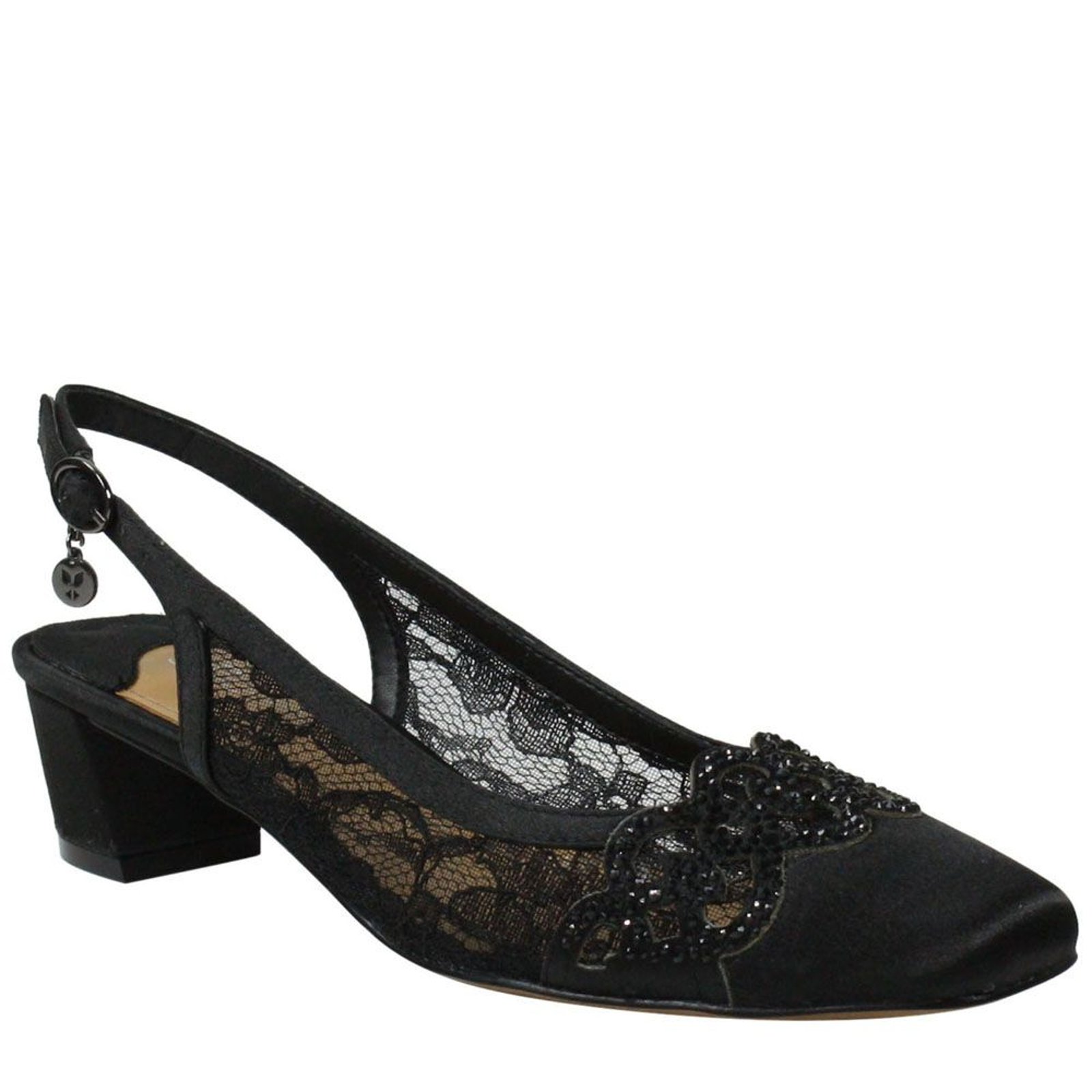 *Dress up any day-to-evening occasion ensemble with this comfortable sling *Fabric upper with feminine lace detailing *Adjustable buckle for easy wear *Memory foam insole for added cushion and comfort *1-1/2" block heel