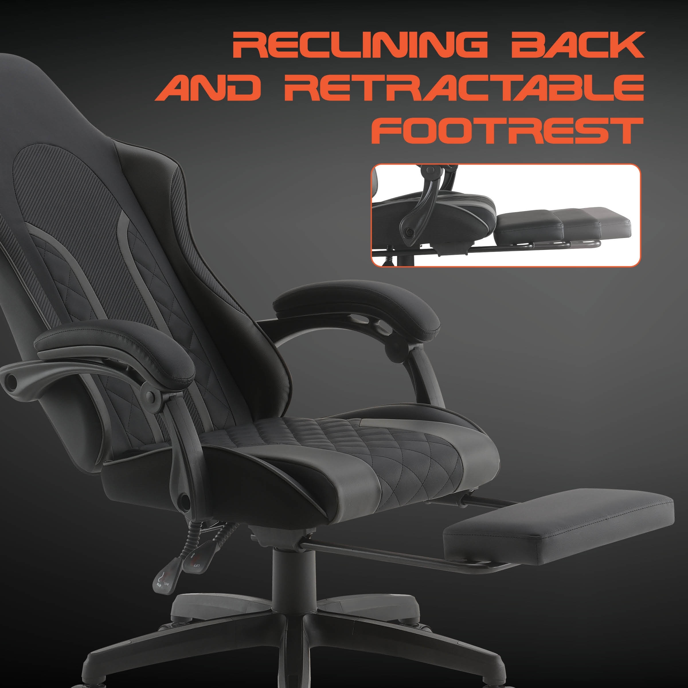 Great performance online is backed back a throne where it all takes place. This race-car-inspired gaming chair presents a chevron pattern with a diamond stitch back and seat design. The tall back reclines while the armrests are height adjustable.