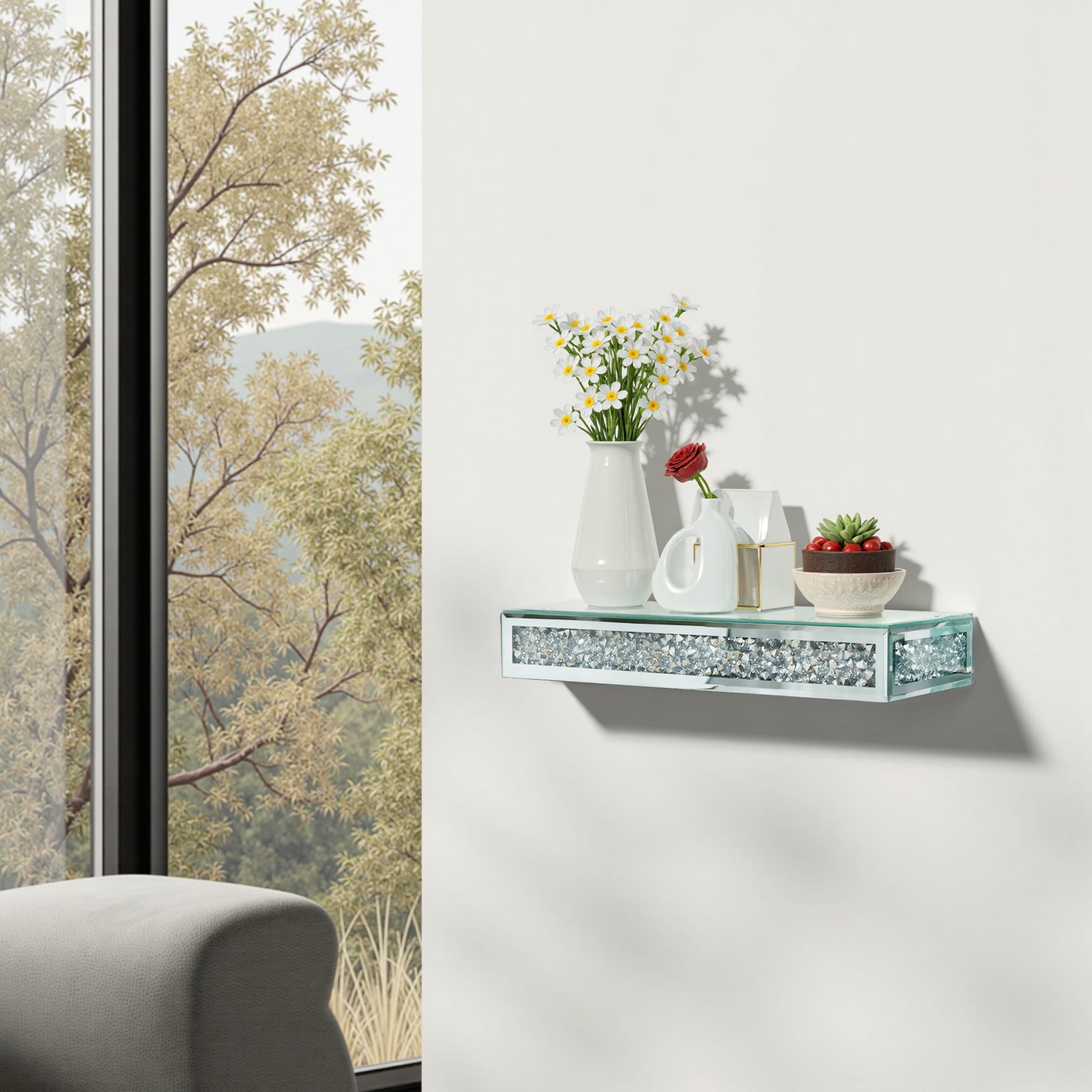 This wall shelf features a striking design with crushed diamonds intricately inlaid along the front panel, framed by a silver glass and MDF board, making it eye-catching and instantly elevates any space.The smooth mirrored surface not only enhances the…