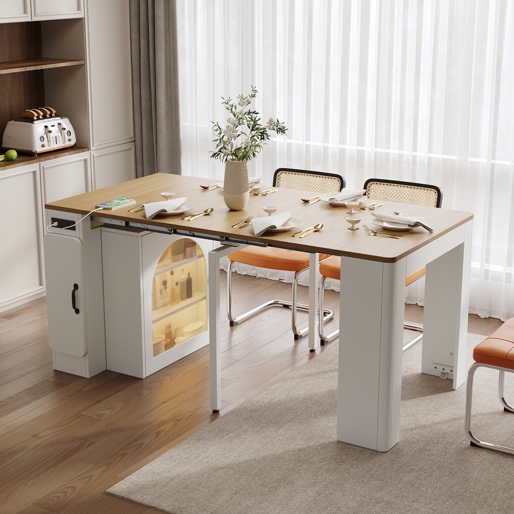 Product Features Timeless Modern Aesthetics: This modern extendable dining table features a striking visual contrast and creating a minimalist fresh style. Accented with metal handles and arched fluted glass doors, it exudes exquisite craftsmanship.