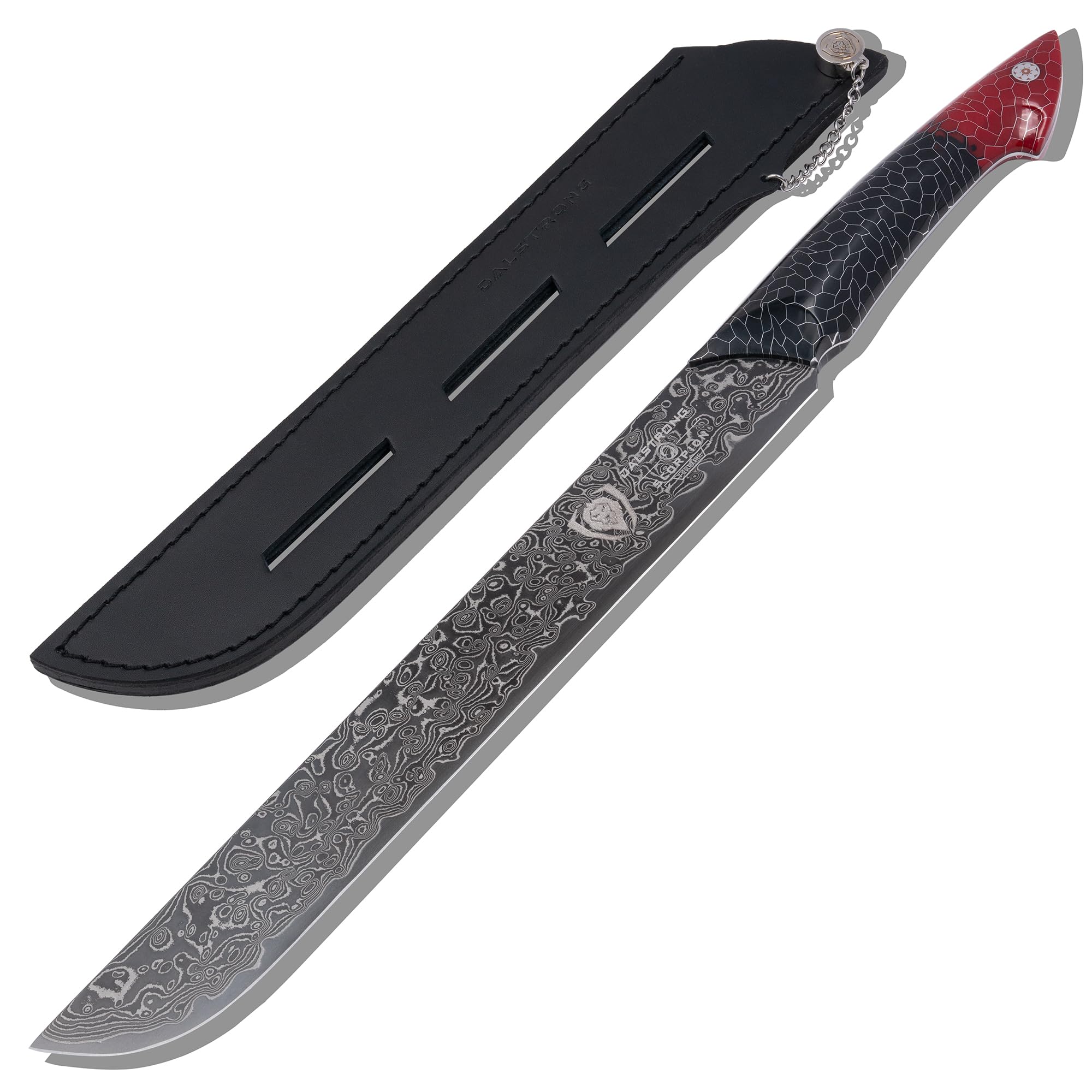 Scorpion Slicing Precision: Long, narrow blade is built for ultra-thin slicing—perfect for roasts, brisket, fruit, and large layer cakes. Rounded tip minimizes tearing and accidental piercing. Signature Balance: Premium red/black resin handle reinforced with honeycomb aluminum mesh delivers durability, shock absorption, and reduced wrist strain. Full-tang blade and hybrid bolster ensure control. Cutting Power: Forged from Dalstrong V12 Ultra Steel and clad in 69 layers of Black Spiral Damascus. Ultra-thin 8–12° edge glides effortlessly through proteins and vegetables with minimal resistance. Comfort & Care: Stain-resistant, easy to clean, and dishwasher safe for professional use. Includes a biker-inspired leather sheath with snap closure for secure storage and transport. Dalstrong Trust: Backed by Dalstrong’s dedicated customer support and finished with premium, gift-ready packaging. In a single, smooth motion, the Scorpion Hellfire 11" Slicer knife peels layers from roasts and briskets. The rounded tip minimizes the risks of accidental piercing or shredding of the meat. The long, narrow blade is optimized for creating thin slices, and makes this knife a great choice for turning a whole roast into sandwich slices, portioning pineapple or melon, or slicing through a massive layer cake in one go. Each blade in this series is forged from a uniquely curated, ultra-durable steel made just for Dalstrong. We hired a team of scientists to make the ultimate culinary steel, just for us. The Japanese V-12 Ultra steel is specially crafted for increased hardness and markedly improved corrosion resistance. Added cobalt gives it greater wear resistance and hot hardness to withstand the heat of the kitchen. Comparable to VG-10, this steel is an all-around performer in strength, sharpness and corrosion resistance. We’ve finished it with a nitrogen cooling process to create the intricate spiral “Sandstorm” Damascus pattern. Forged of Japanese V12 Ultra Steel, this fiercely gorgeous blade is rated at 60+ Rockwell Hardness for effortlessly piercing meat and veggies. With 69 layers of steel for enhanced strength and durability, strike without hesitation. The steel is folded and cooled into a beautiful spiral “Sandstorm” Damascus. Painstakingly honed to 8-12 degrees, you can expect clean cuts every time you carve through your chosen prey. Pulling inspiration from the Hellfire-filled stinger of the blade’s merciless namesake, the red and black resin handle with honeycomb pattern mesh enhances the brutal beauty of the series. Enjoy the enhanced comfort and maneuverability of the ergonomic design as you prep dishes that will leave jaws open wide and salivating. Paired with the custom-fit leather sheath, your knife will stay sharp and protected whether on the go or stashed away.
