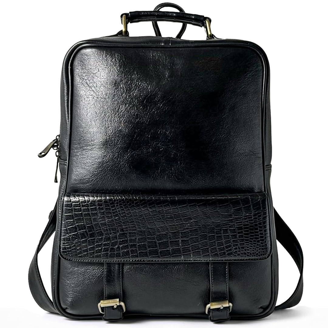Look sharp, feel confident: Black crocodile-textured leather backpack adds instant polish to your daily look, from office to after-hours Stay organized all day : Two roomy sections in the leather laptop bag keep your 15.6″ computer, 13 inch macbook, charger, notebook, and essentials neat and easy to reach. Move freely, carry light: A 21 L capacity and padded straps give comfort and balance for long commutes without bulk. Protect what matters: Hidden anti-theft pocket keeps your phone, wallet, or passport safe while you travel or commute. Built to last years: Handcrafted leather, metal zippers, and strong stitching make this daypack reliable day after day Luxury that works as hard as you: Sleek design of our slim backpack meets everyday utility, blending professional style with real-world function. Carry confidence and style with the Black Leather Laptop Backpack (15.6"). Perfect for professionals, students, and commuters, it combines premium looks, smart organization, and lasting comfort. Look Confident. Carry Luxury. Handcrafted black crocodile-textured leather with metal zippers gives a polished, professional look. Stand out from ordinary nylon or faux-leather bags while carrying your essentials. Organized for Your Busy Day. Two spacious compartments fit a 15.6” laptop or MacBook Air and your daily essentials like charger, notebooks, headphones, sunglasses, and water bottle. The 21L capacity keeps everything tidy and easy to reach. Stay Secure. The hidden anti-theft pocket protects your phone, wallet, and passport while commuting or traveling, giving you peace of mind wherever you go. Built to Last. Reinforced stitching, durable metal zippers, and handcrafted leather make this backpack strong and reliable. Weighing only 2.18 lbs, it’s light enough for everyday use. Style Meets Comfort. Lightweight and compact with padded shoulder straps, it balances professional style with ergonomic comfort. Perfect for work, school, or travel — carry more without bulk.
