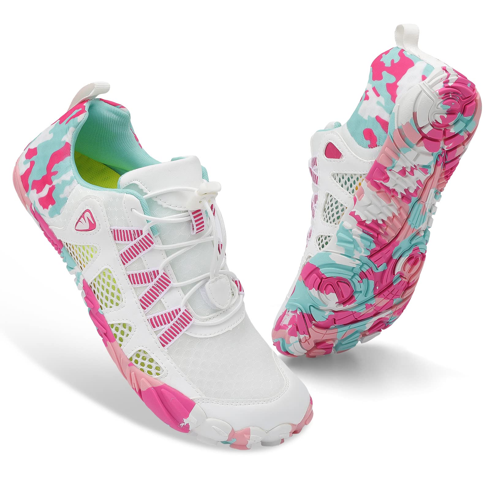 WIDE TOE BOX DESIGN: Fashion shoes tip, with a toe appearance, give you a more fashion and unique wearing experience. Wide enough toe boxes provide more comfort and stability. Anti-collision shoe toes will effectively your feet from getting hurt by rock and stone, provide you better security in outdoor activities. FLEXIBLE AND LIGHTWEIGHT: Feel like you're wearing socks with our high-quality, lightweight design of swim shoes that perfectly conforms to your feet. Ideal for any water activity, with elastic shoelaces for quick adjustments and easy on/off. FOOT SAFETY AND COMFORTABLE: The rubber soles, with a really comfortable and thick foam arch-support insert inside of them, are flexible yet thick enough to protect your feet from stepping on rock and stone. At the same time, the insole perfectly matches the shoes and prevents the insole gets detached when you are hiking or playing water sports. GOOD BREATHABILITY AND CONVENIENT: The aqua shoes feature soft upper with stretch breathable ultra light weight fabric for fast draining and cross ventilation help shoes get dry quickly. Besides, the good ventilation of shoes can also prevent your feet from sweating, thus creating a dry, comfortable and healthful environment for your feet. VERSATILE & PRACTICAL: Our water shoes come in multiple styles to choose from. Not only does it have the function of water shoes, whether you are on the beach, hiking, swimming, daily wear, yoga, or indoor fitness, it can provide a perfect combination of comfort, performance, and style.