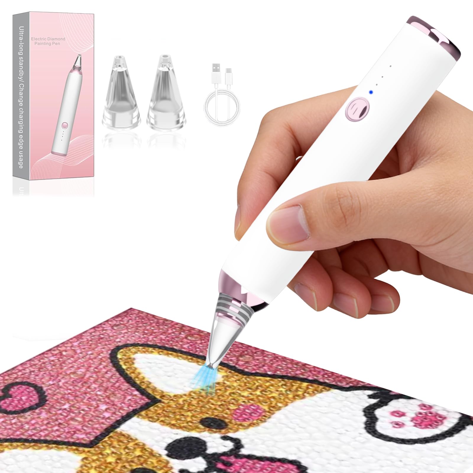 【Auto-Suction & Effortless Gliding】This electric diamond pen instantly picks up diamonds with gentle suction—just press and glide like writing. No more sticky wax, separate tools, or manual hand fatigue. Its upgraded vacuum system ensures smooth, continuous workflow, letting beginners and experienced crafters complete artwork neatly and efficiently 【Dual Nozzles for All Diamond Types】Equipped with 1 round and 1 square interchangeable nozzle, this electric diamond pen fits round, square, and most other shaped diamonds—no need to buy extra accessories. The precision-engineered structure prevents jamming or misalignment, ensuring every diamond is placed neatly and smoothly. Boosting your crafting efficiency by up to 50%, helping you finish diamond art projects faster without compromising quality 【3-Speed Adjustable Suction & Smart Chip】Long press the power button for 1.5s to turn on (1st LED lights up); short press to switch between low/medium/high suction modes (LEDs cycle sequentially). Low speed for small delicate diamonds/detailed areas, medium speed for daily crafting, and high speed for large surfaces or heavier diamonds—firmly holds all diamond sizes without slipping. Built-in smart chip prevents accidental touches, avoiding misoperations during use; the intuitive LED indicators let you clearly know the current suction level, ensuring safe, precise control every time 【Rechargeable Design& 40-Min Type-C Fast Charge】Equipped with a 400mAh large-capacity battery and Type-C charging cable, fully charges in just 40 minutes—saves 75% charging time compared to ordinary diamond pens. It provides 2-3 hours of continuous use (varies by suction speed: 3 hours at low speed, 2 hours at high speed). You can use it while charging to avoid creative interruptions. When the battery is low, the three LEDs flash 10 times and auto-shut down to remind you to charge, saying goodbye to frequent charging troubles 【Smart Anti-Mistouch + Ergonomic Lightweight Design】Built-in smart chip prevents accidental touches, ensuring safe operation even during long crafting sessions. Weighing only 0.14lbs with a compact size, it’s lightweight enough to slip into your bag effortlessly—perfect for on-the-go creation at home, travel, cafes, or outdoor gardens. The ergonomically designed grip and balanced weight distribution reduce hand fatigue, letting you craft comfortably all day without strain. Its compact and stylish color scheme, paired with a complete accessory set, also makes it an ideal gift for DIY diamond art enthusiasts